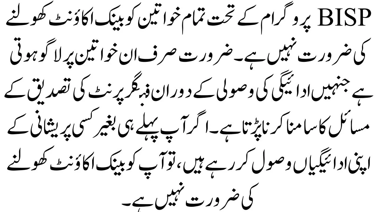 Not all women under the BISP program need to open a bank account. The requirement only applies to women who face issues with fingerprint verification during payment collection. If you are already receiving your payments without any problem, you do not need to open a bank account.