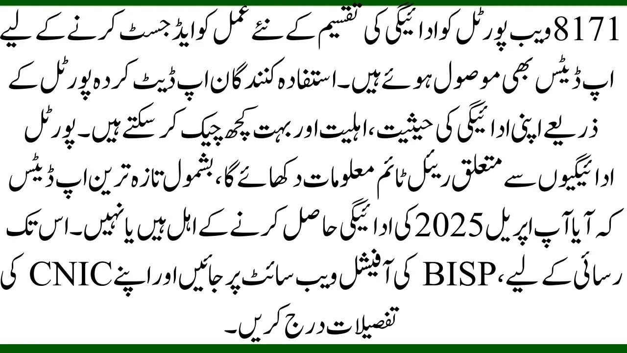 The 8171 web portal has also received updates to accommodate the new payment distribution process. Beneficiaries can check their payment status, eligibility, and more through the updated portal. The portal will display real-time information regarding the payments, including the latest updates on whether you are eligible to receive the April 2025 payment. To access this, visit the official BISP website and enter your CNIC details.