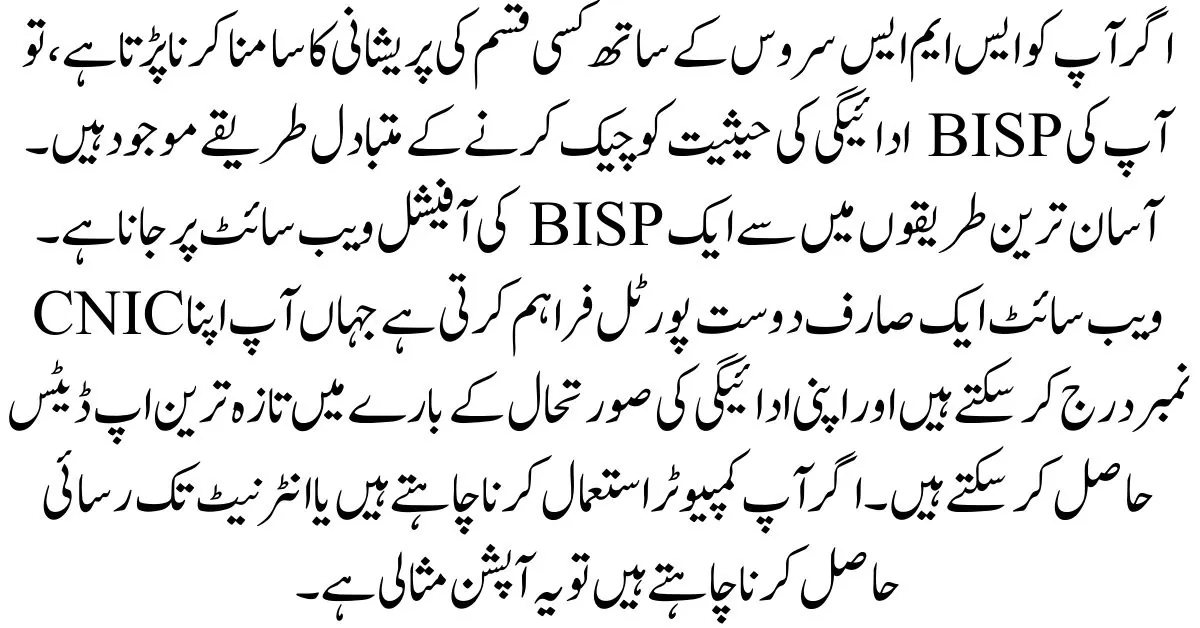 If you are still facing issues or need further assistance, visiting your nearest BISP office is another option. The staff at the office will help you verify your payment status and assist you with any problems or concerns you may have. This method ensures that you receive personalized support for your payment queries.