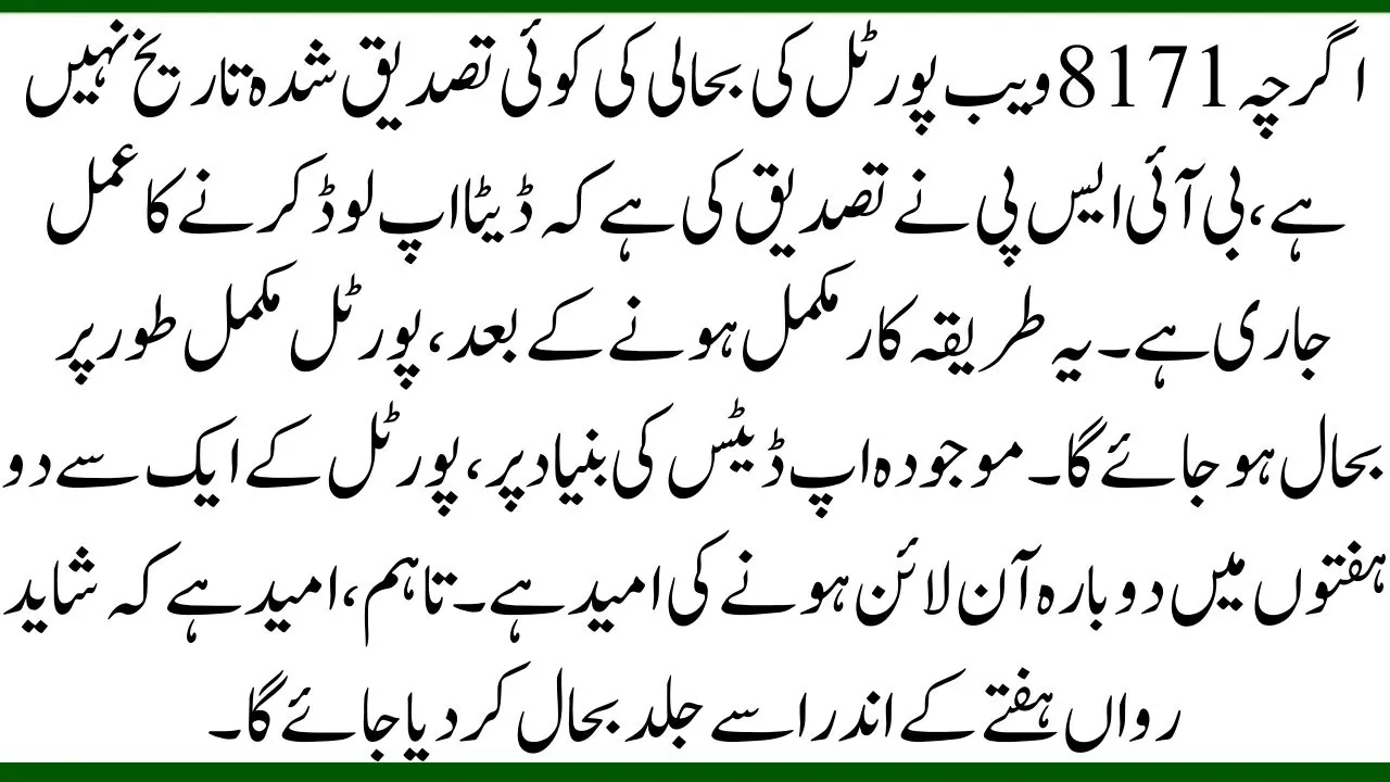 Although there is no confirmed date for the restoration of the 8171 Web Portal, BISP has confirmed that the data upload process is ongoing. Once this procedure is completed, the portal will be fully restored. Based on current updates, the portal is expected to be back online in one to two weeks. However, there is hope that it might be restored even sooner, perhaps within the current week.