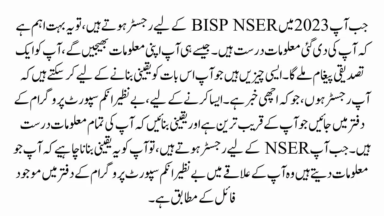 When you register for the BISP NSER in 2024, the information you give must be correct. As soon as you send in your information, you’ll get a confirmation message. There are things you can do to make sure you get registered, which is good news. To do this, go to the Benazir Income Support Program office that’s closest to you and make sure that all of your information is correct. When you register for NSER, you should make sure that the information you give fits what is on file at the Benazir Income Support Program office in your area.