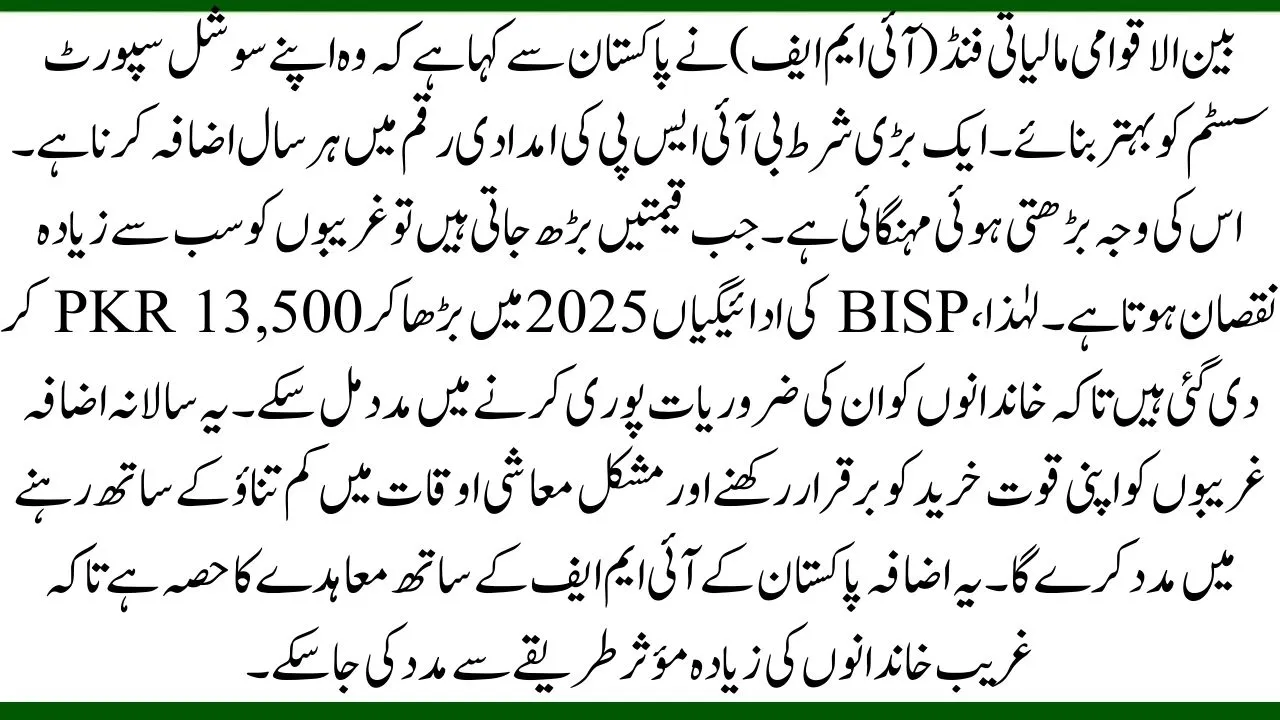 The International Monetary Fund (IMF) has asked Pakistan to improve its social support systems. One major condition is increasing the BISP aid amount each year. The reason for this is rising inflation. When prices go up, poor people suffer the most. So, BISP payments have been raised to PKR 13,500 in 2025 to help families meet their needs. This yearly increase will help the poor maintain their buying power and live with less stress during tough economic times. The increase is a part of Pakistan’s agreement with the IMF to support poor families more effectively.