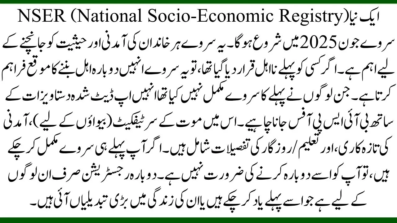 A new NSER (National Socio-Economic Registry) survey will start in June 2025. This survey is important for checking the income and status of every family. If someone was marked ineligible before, this survey gives them a chance to become eligible again. People who didn’t complete the earlier survey must visit the BISP office with updated documents. This includes death certificates (for widows), income updates, and education/employment details. If you already completed the survey before, you don’t need to do it again. Re-registration is only for those who missed it earlier or have major changes in their life.