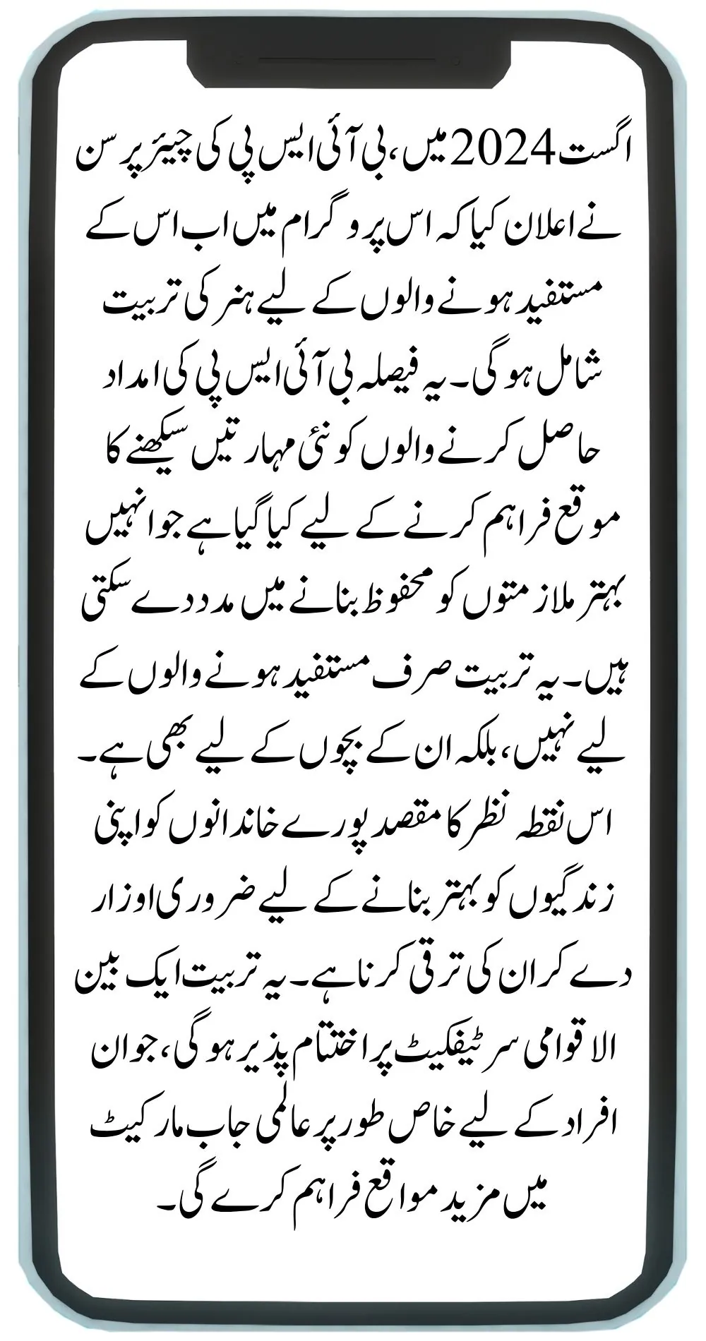 In August 2024, the chairperson of BISP announced that the program would now include skill training for its beneficiaries. This decision was made to provide those receiving BISP aid with the opportunity to learn new skills that can help them secure better jobs. The training is not just for the beneficiaries themselves, but also for their children. This approach aims to uplift entire families by giving them the tools they need to improve their lives. The training will culminate in an international certificate, which will open up more opportunities for these individuals, especially in the global job market.