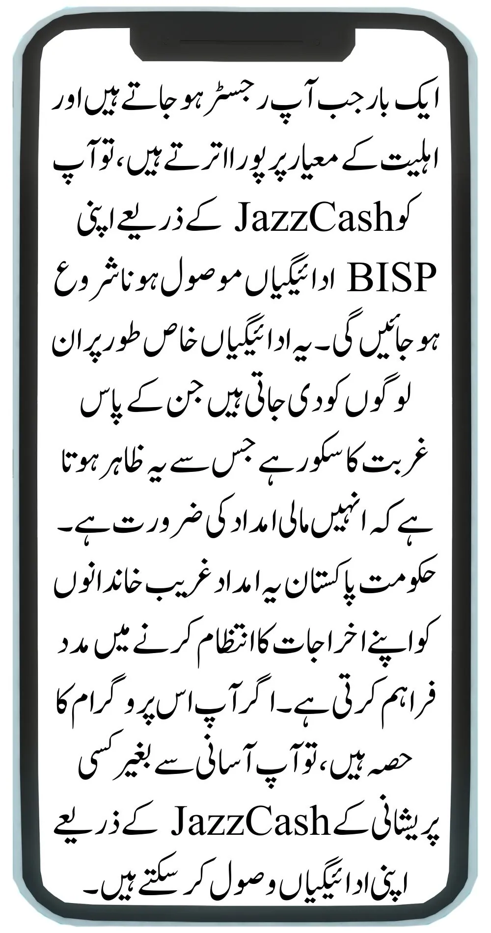Once you are registered and meet the eligibility criteria, you will start receiving your BISP payments through JazzCash. These payments are specifically given to those who have a poverty score indicating they need financial assistance. The government of Pakistan provides this aid to help poor families manage their expenses. If you are part of this program, you can easily receive your payments through JazzCash without any hassle.