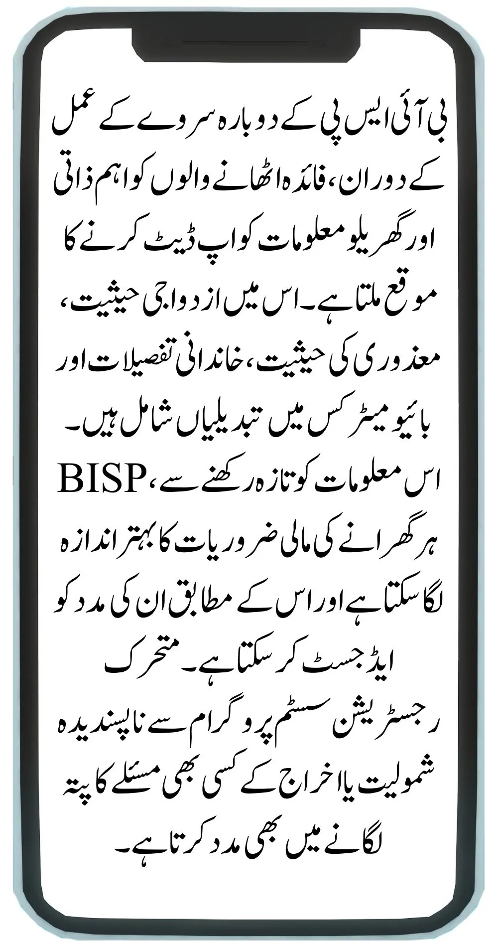 During the BISP re-survey process, beneficiaries have the opportunity to update important personal and household information. This includes changes in marital status, disability status, family details, and biometrics. By keeping this information current, BISP can better assess the financial needs of each household and adjust their support accordingly. The dynamic registration system also helps detect any issues of unwanted inclusion or exclusion from the program.