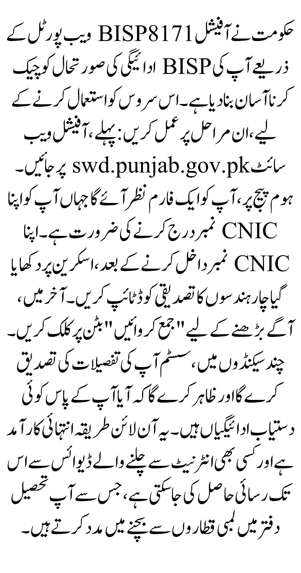 If you do not have access to the internet, you can still check your BISP payment status via SMS. To do this, open your mobile phone’s SMS application and type your 13-digit CNIC number. Send the message to 8171. You will receive a reply confirming whether you are eligible for the BISP payment and the amount available in your account. This SMS service provides a quick and convenient way to stay informed about your financial support without needing internet access.
