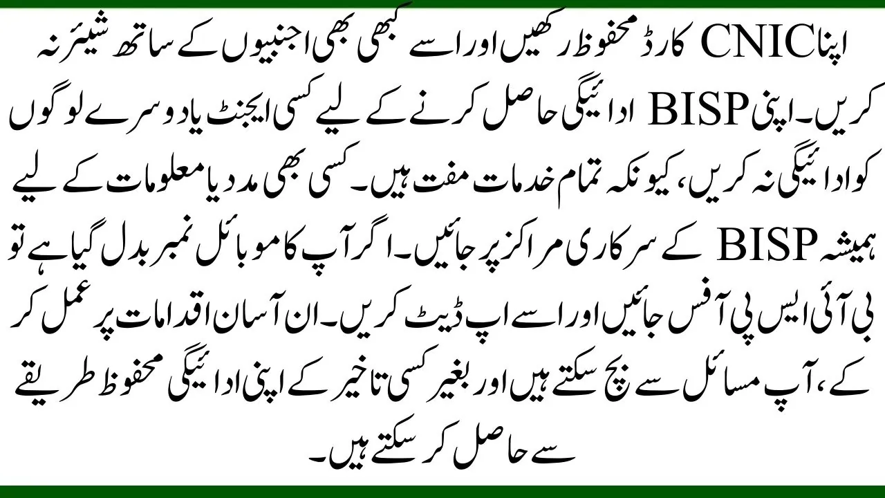 Keep your CNIC card safe and never share it with strangers. Do not pay any agents or other people to receive your BISP payment, as all services are free. Always visit official BISP centers for any help or information. If your mobile number has changed, go to the BISP office and update it. By following these simple steps, you can avoid problems and get your payment safely without any delay.