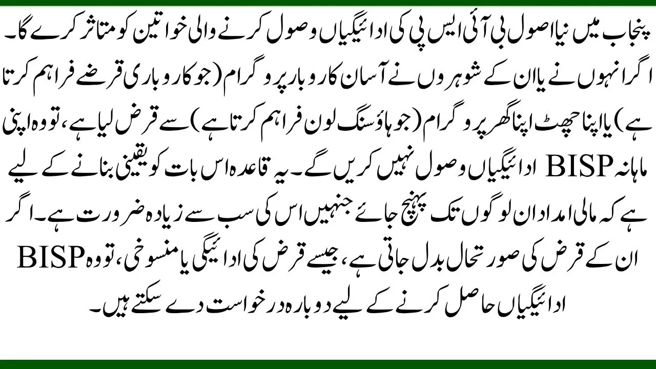 Punjabi women who get BISP payments will be impacted by the new regulation. If they or their spouses have borrowed money from the Apni Chhat Apna Ghar program (for housing) or the Asaan Karobar program (for small companies), they will discontinue getting BISP payments. Their payments will only restart once their loan situation changes