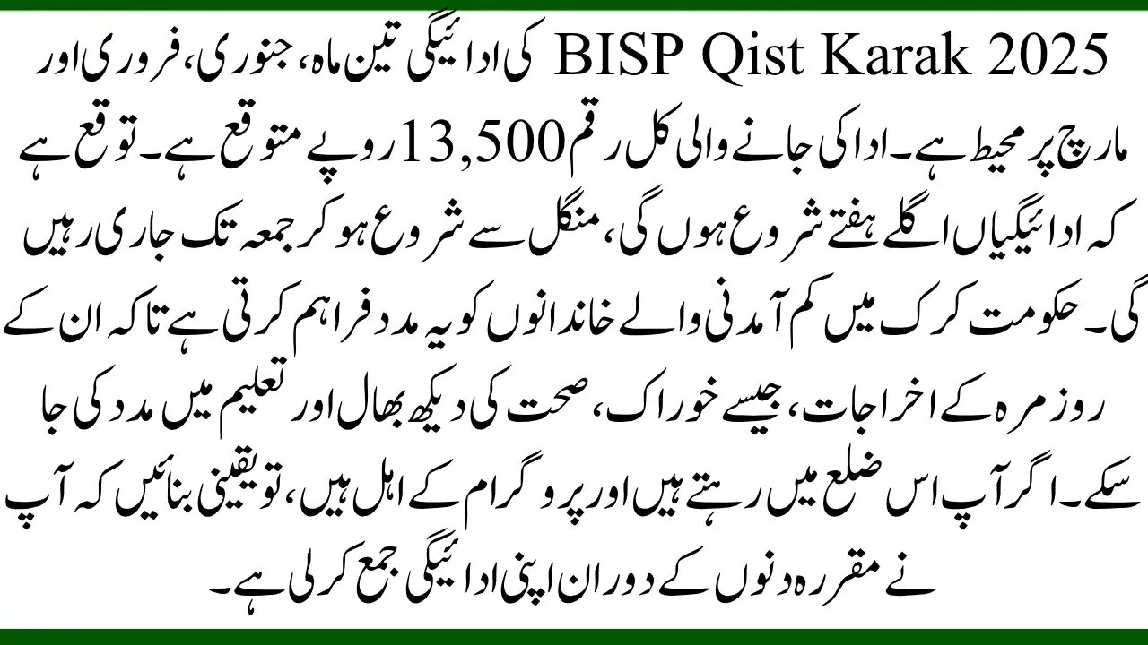 In this article, we are sharing all the details about the BISP Qist Karak 2025 payment process, which is set to begin next week. This payment is a significant support for low-income families in Karak, providing assistance for the months of January, February, and March 2025. To receive your payment, ensure that you meet the eligibility criteria, bring your CNIC, and visit the official payment centers. Always stay alert for any fraud and follow official procedures to ensure you get your payment safely.