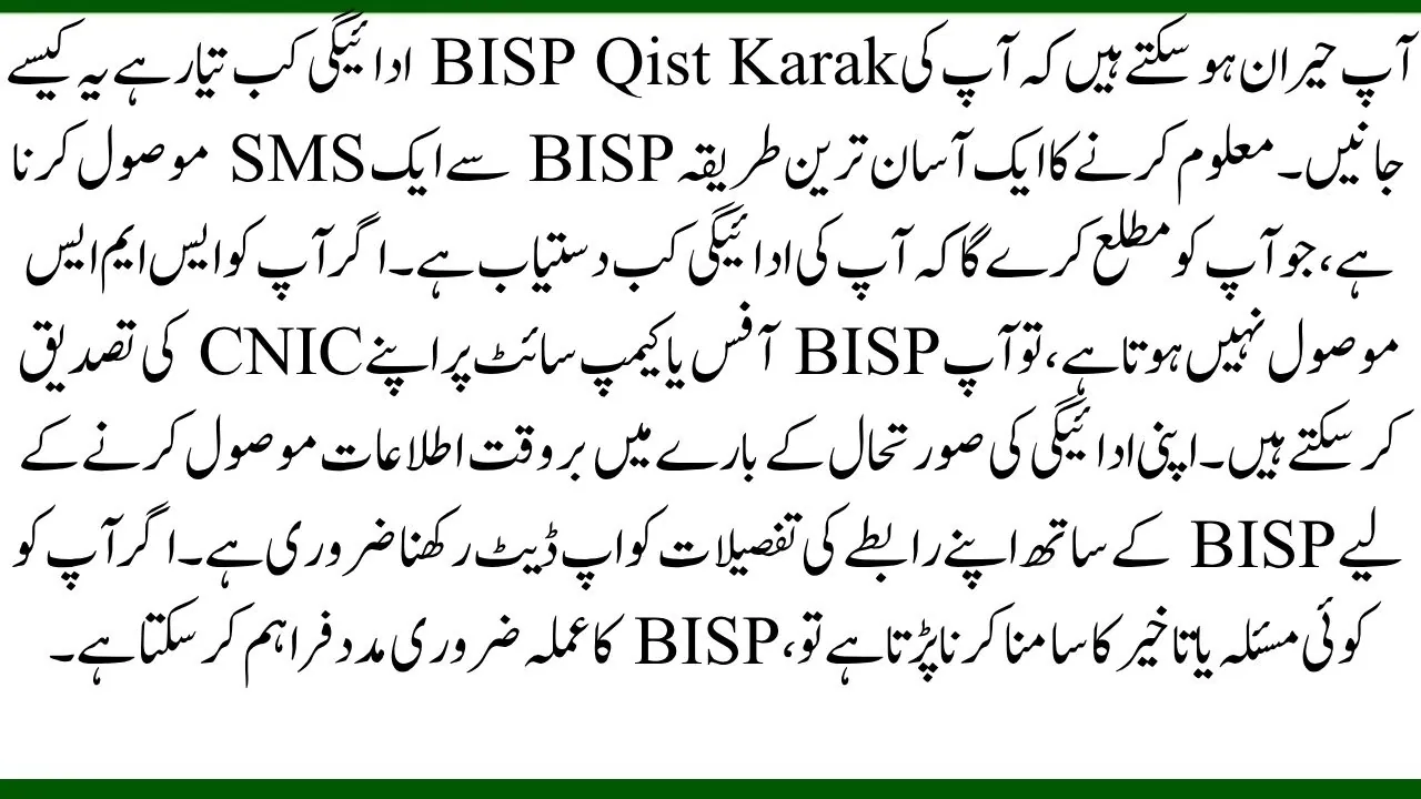 You may wonder how to know when your BISP Qist Karak payment is ready. One of the easiest ways to find out is by receiving an SMS from BISP, which will inform you when your payment is available. If you do not receive an SMS, you can verify your CNIC at the BISP office or campsite. It is important to keep your contact details updated with BISP to receive timely notifications about your payment status. If you face any issues or delays, the BISP staff can provide the necessary assistance.