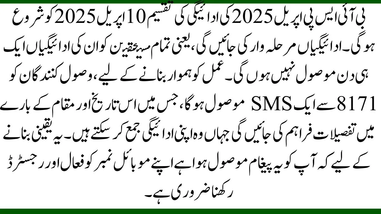 The distribution of the BISP April 2025 payment will begin on April 10, 2025. The payments will be disbursed in phases, meaning not all beneficiaries will receive their payments on the same day. To make the process smoother, recipients will receive an SMS from 8171, providing details about the date and location where they can collect their payment. It’s important to keep your mobile number active and registered to ensure you receive this message.
