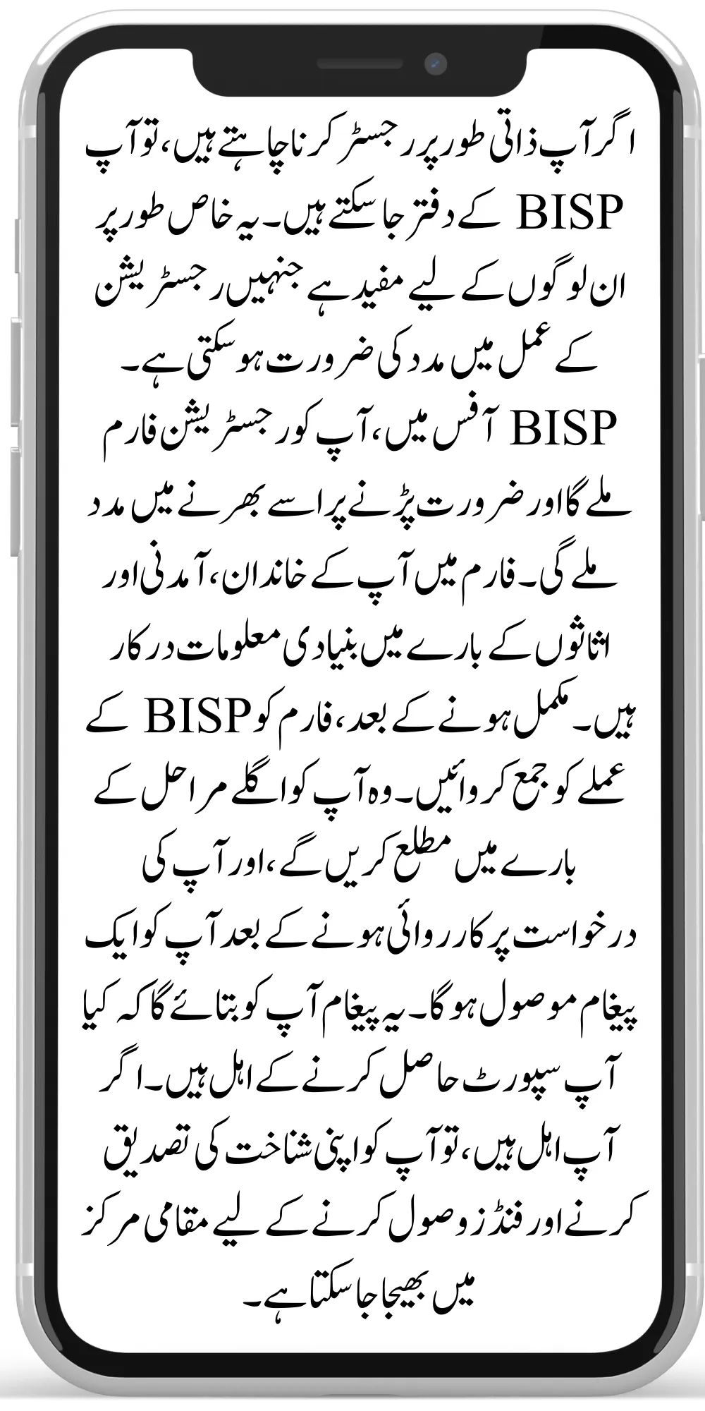 If you prefer to register in person, you can visit a BISP office. This is especially helpful for those who may need assistance with the registration process. At the BISP office, you’ll receive a registration form and assistance in filling it out if needed. The form requires basic information about your family, income, and assets. Once completed, submit the form to the BISP staff. They will inform you about the next steps, and you’ll receive a message once your application is processed. This message will let you know if you are eligible to receive support. If you are eligible, you may be directed to a local center to verify your ID and receive funds.