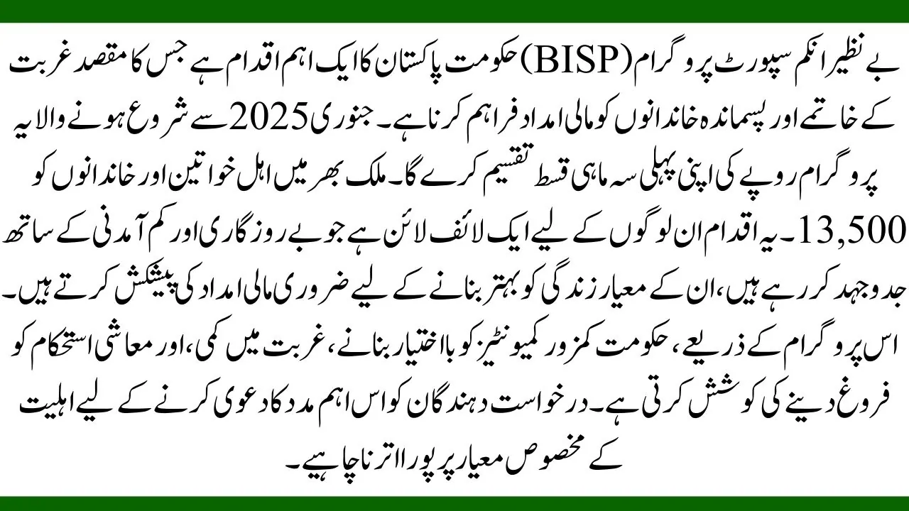 The Benazir Income Support Program (BISP) is a flagship initiative by the Government of Pakistan aimed at alleviating poverty and providing financial aid to underprivileged families. Starting in January 2025, the program will distribute its first quarterly installment of Rs. 13,500 to eligible women and families across the country. This initiative is a lifeline for those struggling with unemployment and low incomes, offering essential monetary assistance to improve their quality of life. Through this program, the government seeks to empower vulnerable communities, reduce poverty, and promote economic stability. Applicants must meet specific eligibility criteria to claim this vital support.