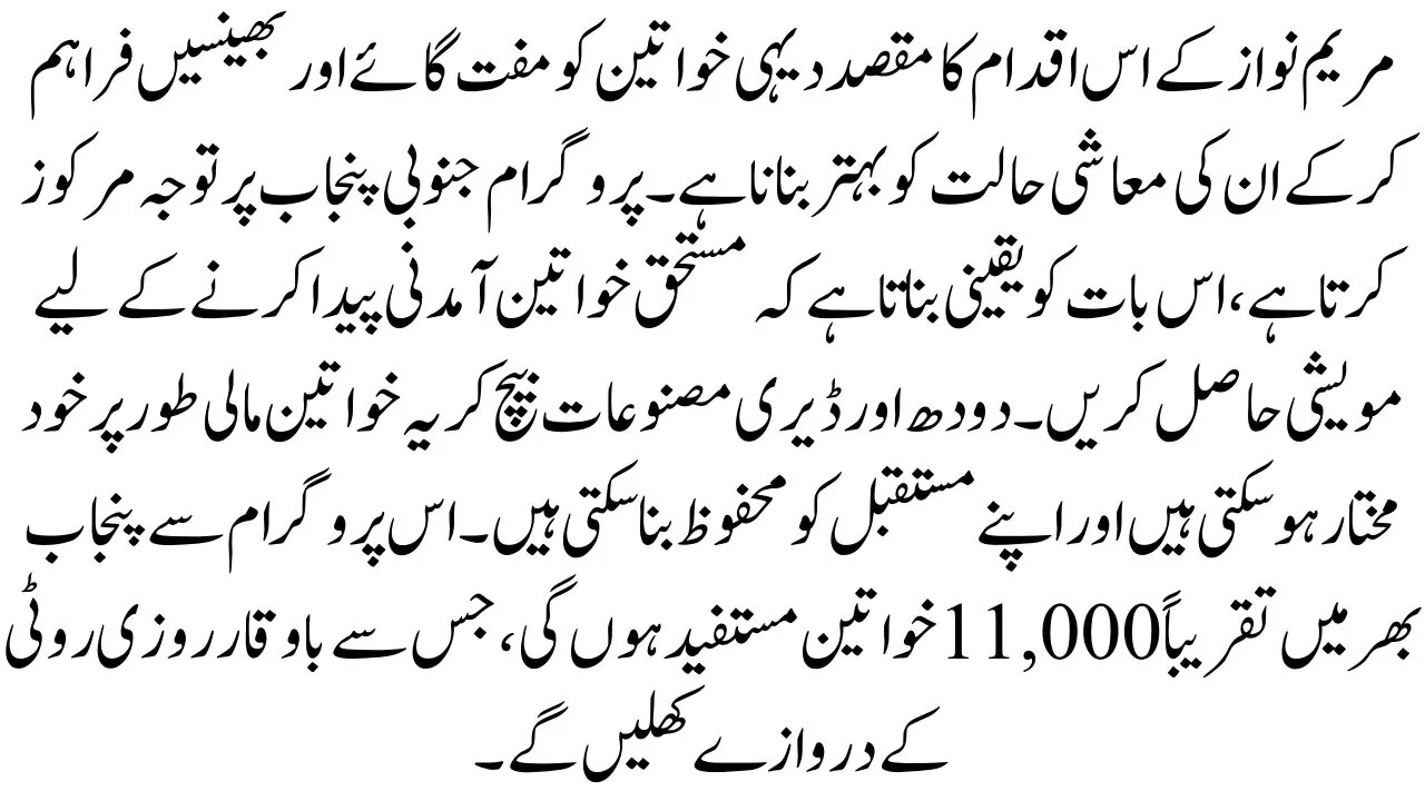 This initiative by Maryam Nawaz aims to improve the economic condition of rural women by providing them with free cows and buffaloes. The program focuses on southern Punjab, ensuring that deserving women receive livestock to generate income. By selling milk and dairy products, these women can become financially independent and secure their future. The program will benefit approximately 11,000 women across Punjab, opening doors for dignified livelihoods.