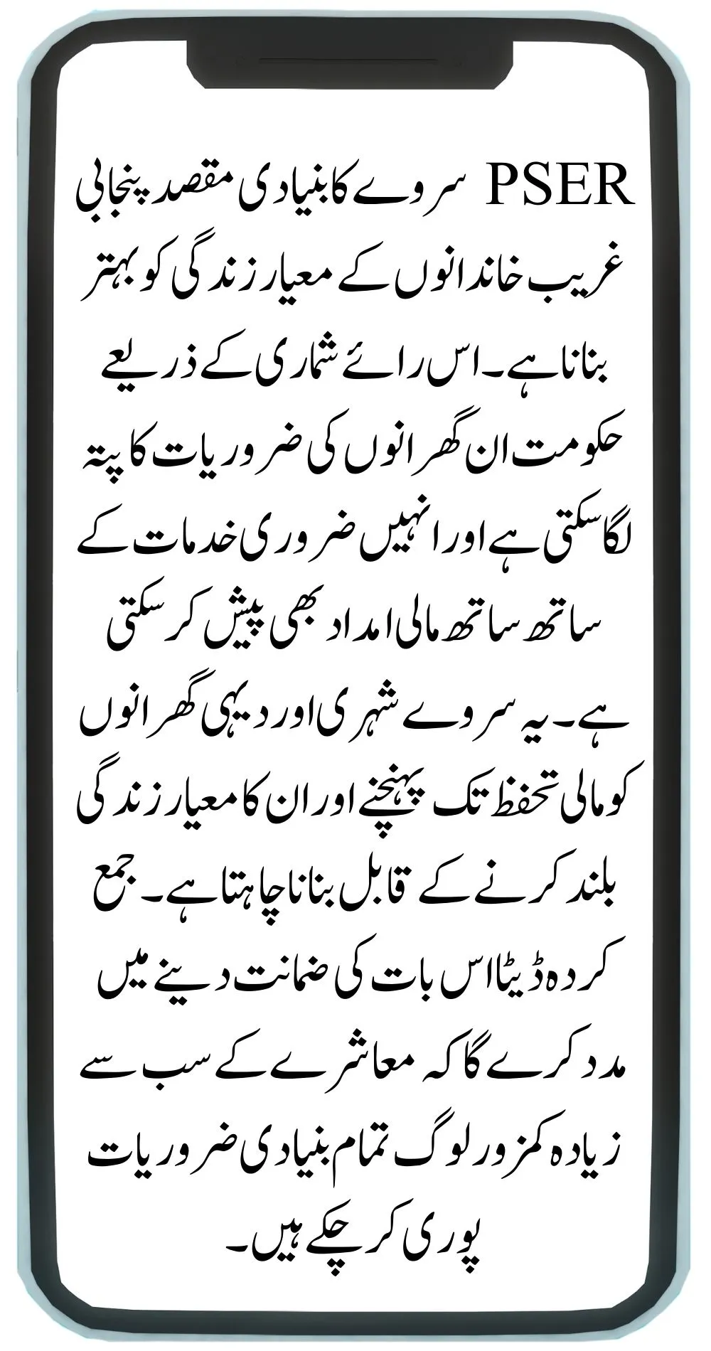 The PSER survey’s primary goal is to better Punjabi poor families’ quality of life. Through this poll, the government may ascertain the requirements of these households and offer them necessary services as well as financial assistance. The poll seeks to enable urban and rural households to reach financial security and raise their standard of living. The gathered data will help to guarantee that the most vulnerable people in society have all fundamental requirements satisfied.