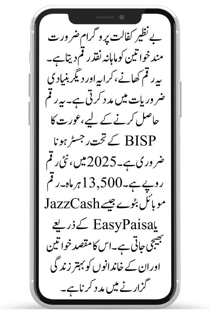 The Benazir Kafaalat Program gives monthly cash to needy women. This money helps with food, rent, and other basic needs. To get this money, the woman must be registered under BISP. In 2026, the new amount is Rs. 13,500 every month. The money is sent through mobile wallets like JazzCash or EasyPaisa. The goal is to help women and their families live a better life.