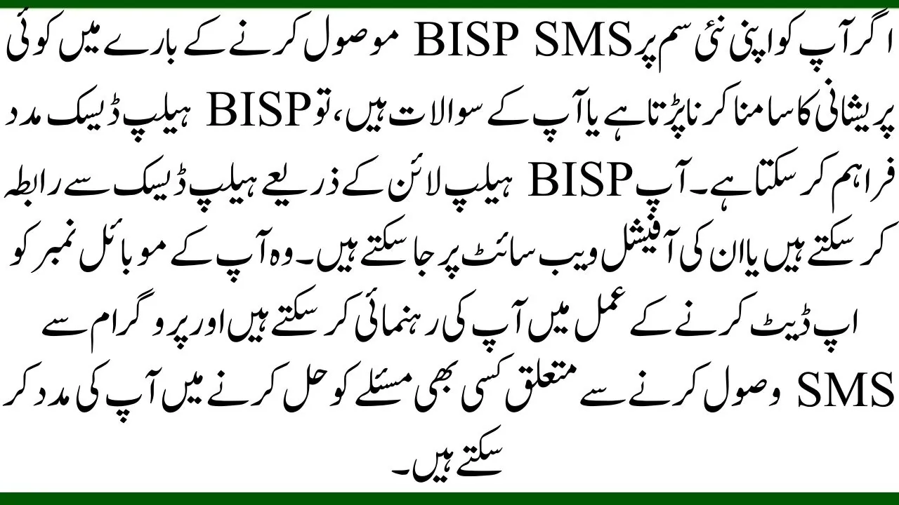 If you encounter any problems or have questions about receiving BISP SMS on your new SIM, the BISP helpdesk can provide assistance. You can contact the helpdesk through the BISP helpline or visit their official website. They can guide you through the process of updating your mobile number and help you resolve any issues related to receiving SMS from the program.