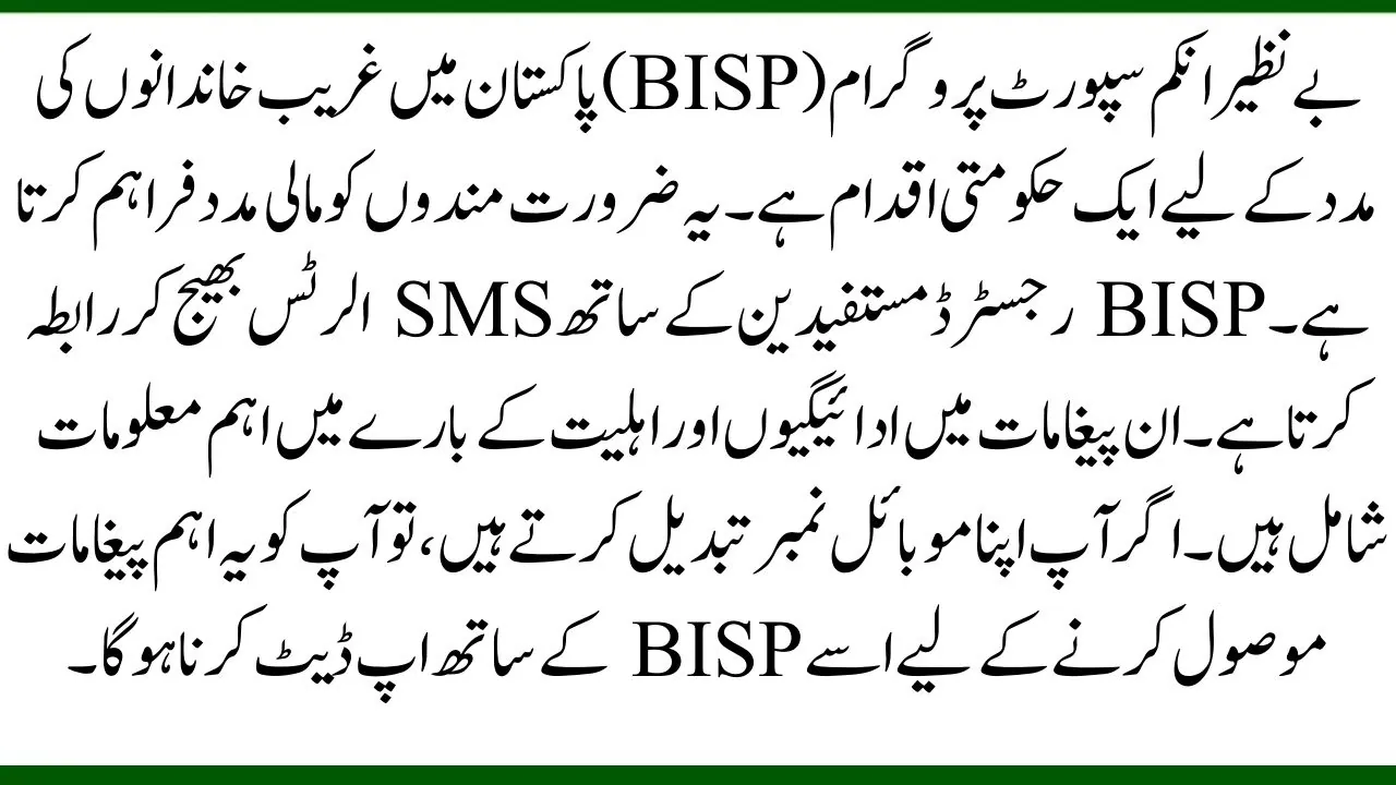 The Benazir Income Support Program (BISP) is a government initiative to help poor families in Pakistan. It provides financial support to those who are in need. BISP communicates with registered beneficiaries by sending SMS alerts. These messages include important information about payments and eligibility. If you change your mobile number, you must update it with BISP to receive these important messages.