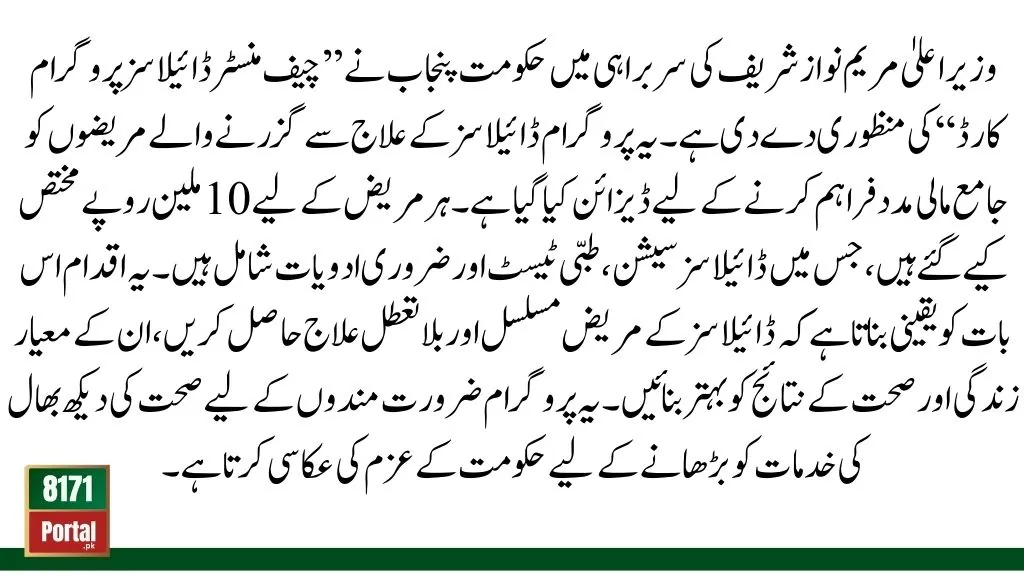 Under the leadership of Chief Minister Maryam Nawaz Sharif, the Punjab government has approved the “Chief Minister Dialysis Program Card.” This program is designed to provide comprehensive financial support to patients undergoing dialysis treatment. Each patient is allocated up to Rs 10 million, which covers dialysis sessions, medical tests, and necessary medications. This initiative ensures that dialysis patients receive continuous and uninterrupted treatment, improving their quality of life and health outcomes. The program reflects the government’s commitment to enhancing healthcare services for those in need.