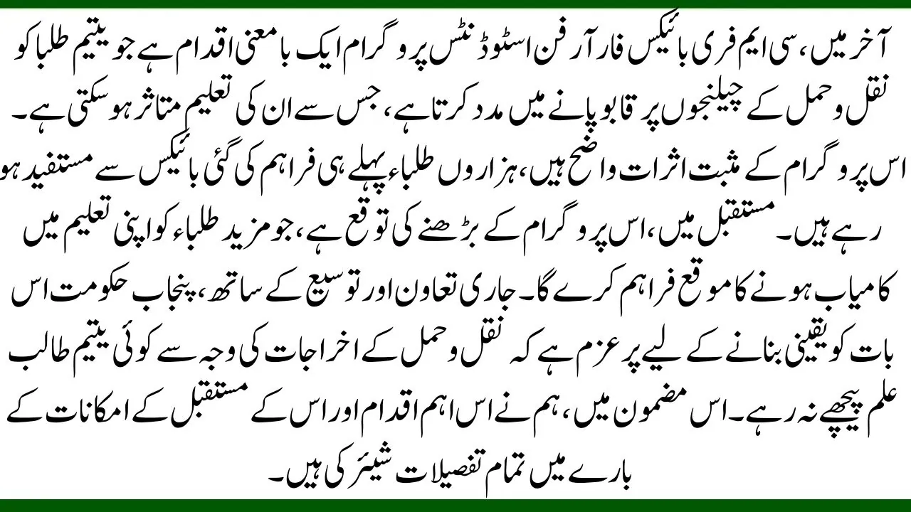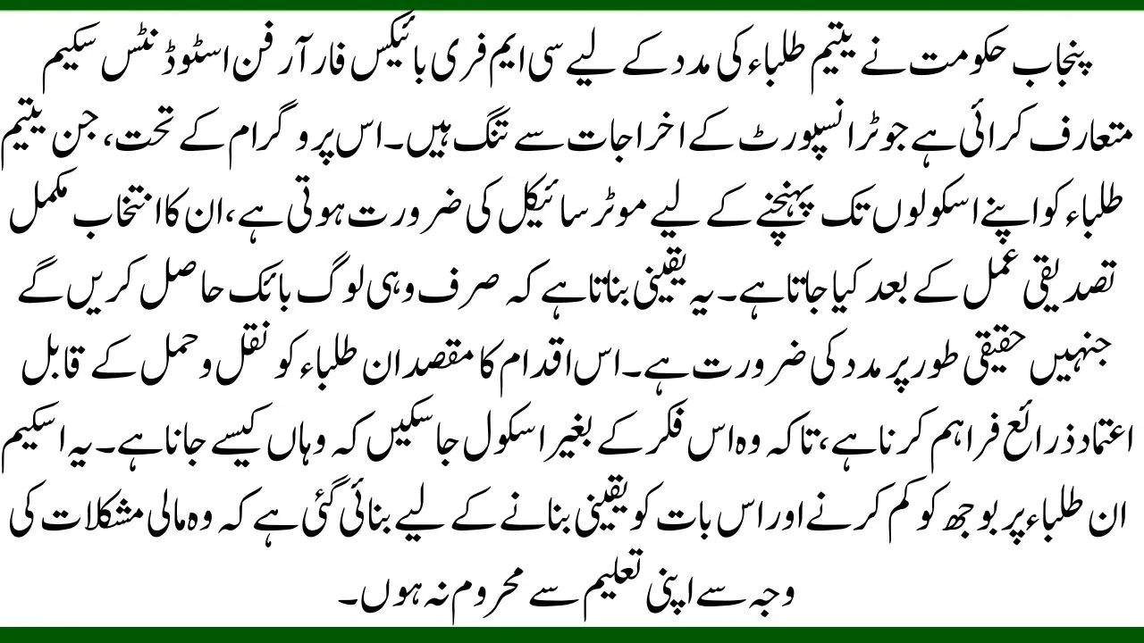 The Punjab government has introduced the CM Free Bikes for Orphan Students scheme to help orphans who struggle with the cost of transportation. Under this program, orphan students who need a bike to reach their schools are selected after a thorough verification process. This ensures that only those who genuinely require assistance will receive bikes. The initiative is aimed at providing these students with a reliable means of transportation, so they can attend school without worrying about how to get there. The scheme is designed to reduce the burden on these students and ensure that they do not miss out on their education due to financial difficulties.