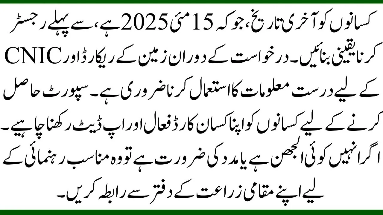 Farmers should make sure to register before the last date, which is May 15, 2025. It is important to use correct information for land records and CNIC during the application. Farmers must also keep their Kisan Card active and updated to receive support. If they have any confusion or need help, they should contact their local agriculture office for proper guidance.