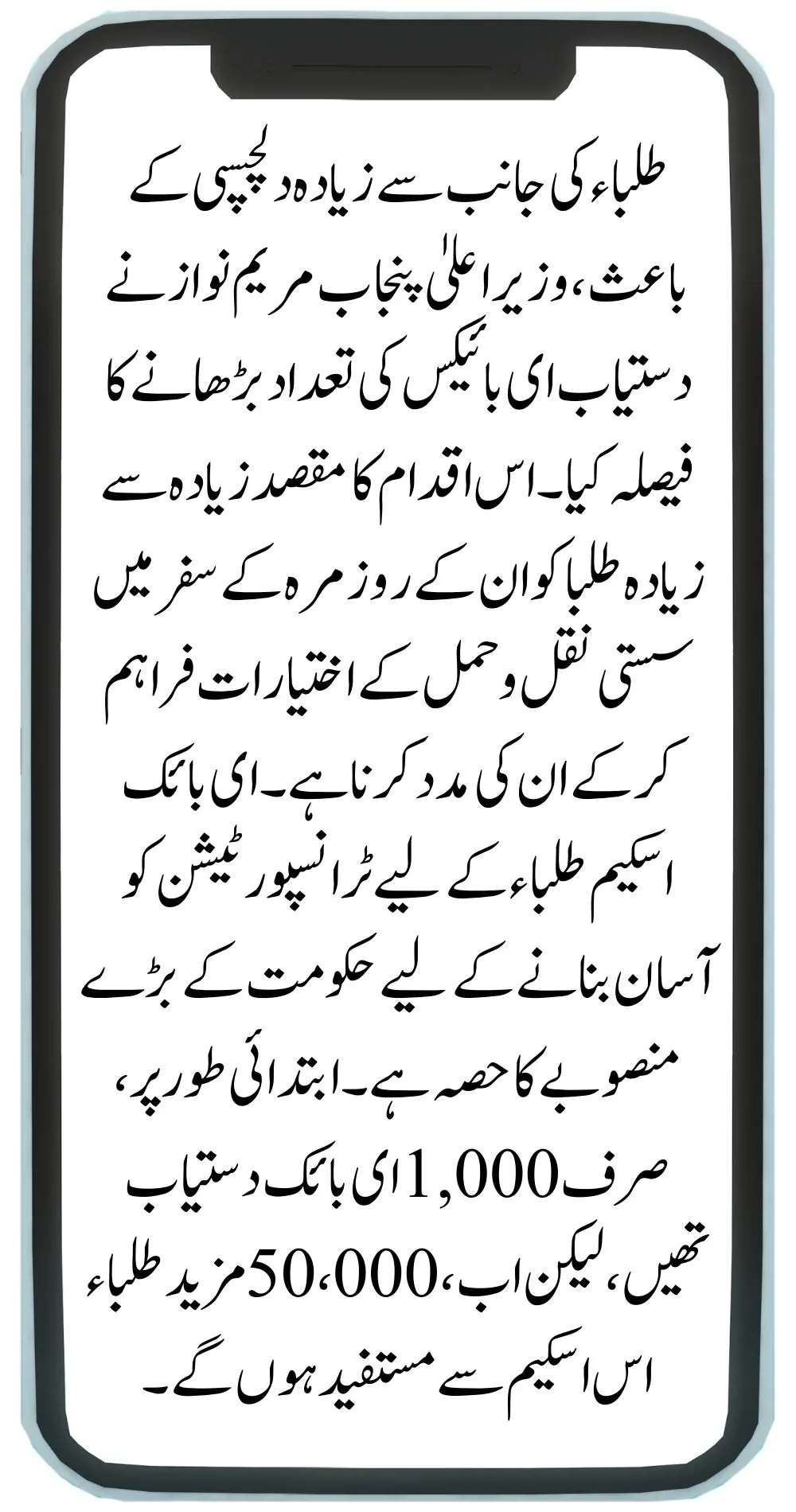 Due to the high interest from students, Punjab’s Chief Minister, Maryam Nawaz, decided to increase the number of e-bikes available. This move aims to help more students with their daily commute by providing them with affordable transportation options. The e-bike scheme is part of the government’s larger plan to make transportation easier for students. Initially, only 1,000 e-bikes were available, but now, 50,000 more students will benefit from the scheme.