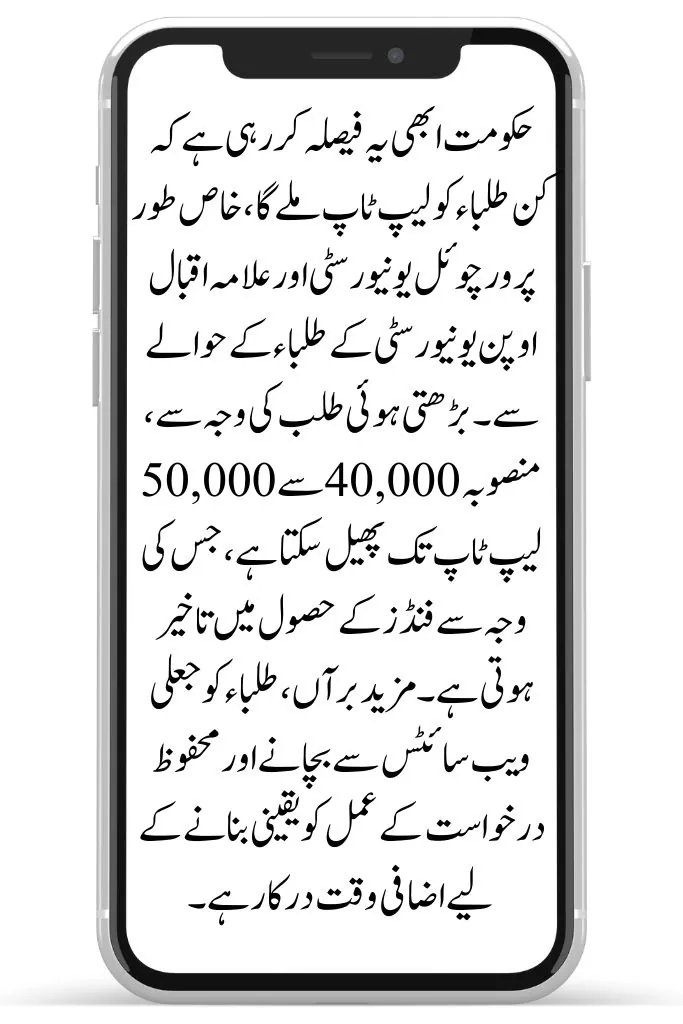 The people in charge are still thinking about who should get the laptops. They are not sure if students from places like Virtual University and Allama Iqbal Open University should get them. This thinking is taking time.