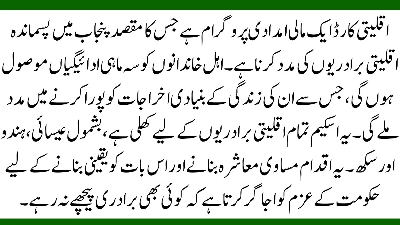 The Minority Card is a financial assistance program aimed at supporting the underprivileged minority communities in Punjab. Eligible families will receive quarterly payments, helping them meet basic living expenses. The scheme is open to all minority communities, including Christians, Hindus, and Sikhs. This initiative highlights the government’s commitment to creating an equal society and ensuring that no community is left behind.