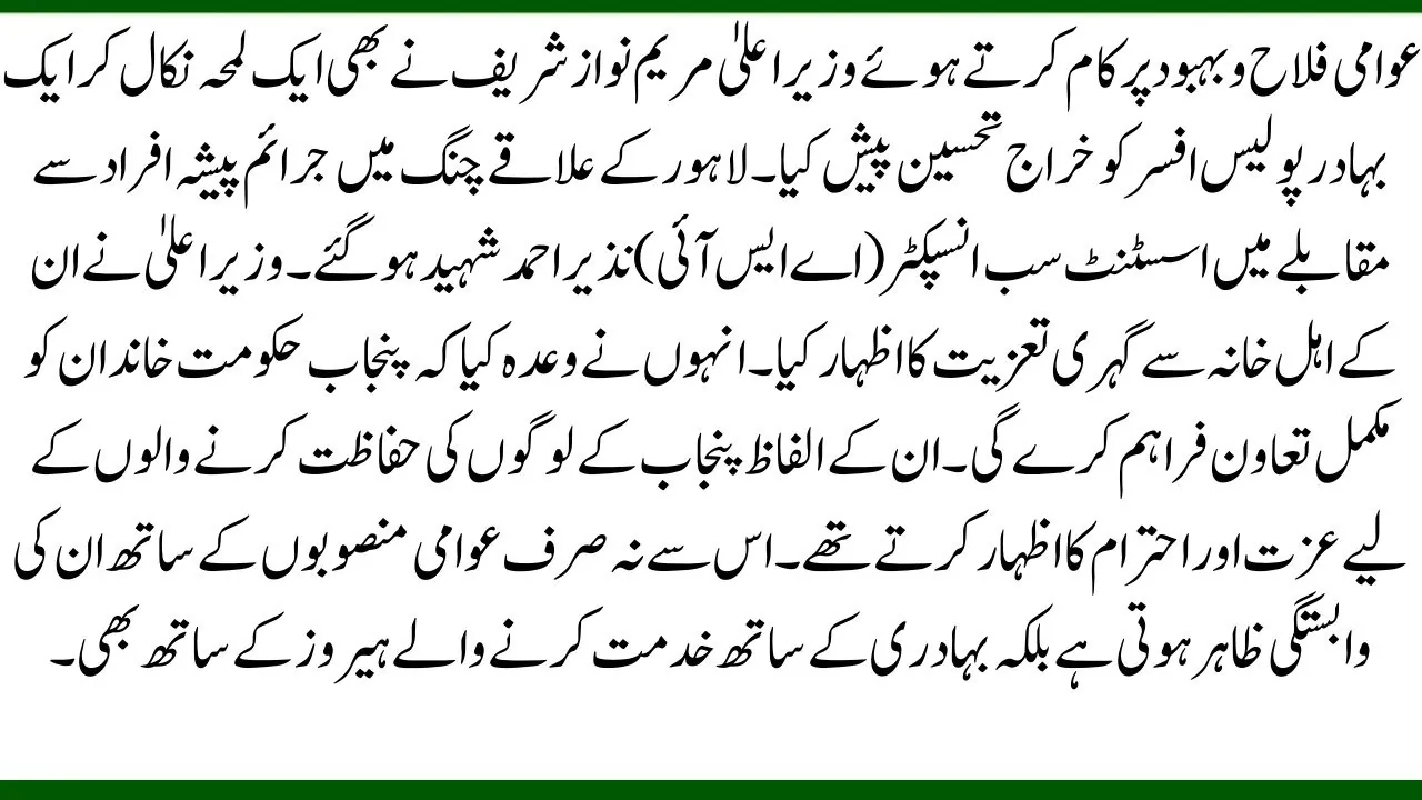While working on public welfare, Chief Minister Maryam Nawaz Sharif also took a moment to pay tribute to a brave police officer. Assistant Sub Inspector (ASI) Nazir Ahmed was martyred in an encounter with criminals in Chung, Lahore. The CM offered her deep condolences to his family. She promised that the Punjab Government would provide full support to the family. Her words showed respect and honor for those who protect the people of Punjab. This shows her commitment not only to public projects but also to the heroes who serve with courage.