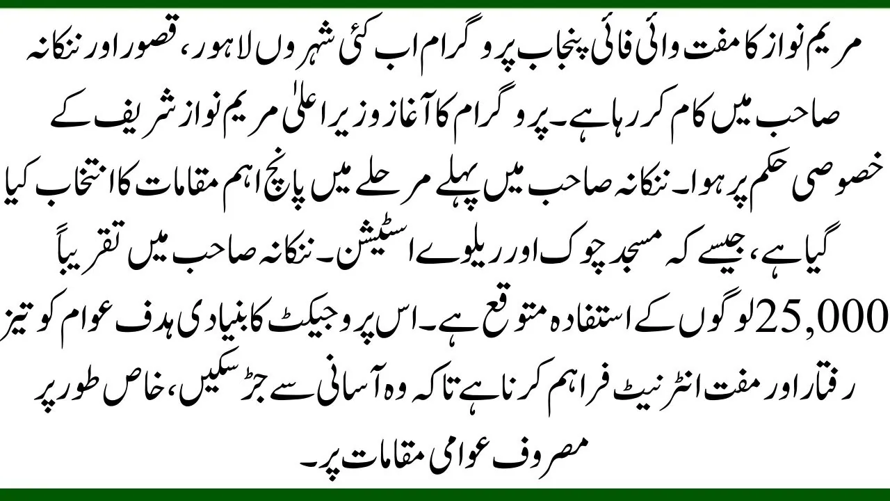 The Maryam Nawaz Free WiFi Punjab Program is now working in several cities: Lahore, Kasur, and Nankana Sahib. The program started on the special orders of Chief Minister Maryam Nawaz Sharif. In Nankana Sahib, five key places have been selected in the first phase, such as Masjid Chowk and the Railway Station. Around 25,000 people in Nankana Sahib are expected to take advantage. The main goal of this project is to provide fast and free internet to the public so they can connect easily, especially in busy public places.