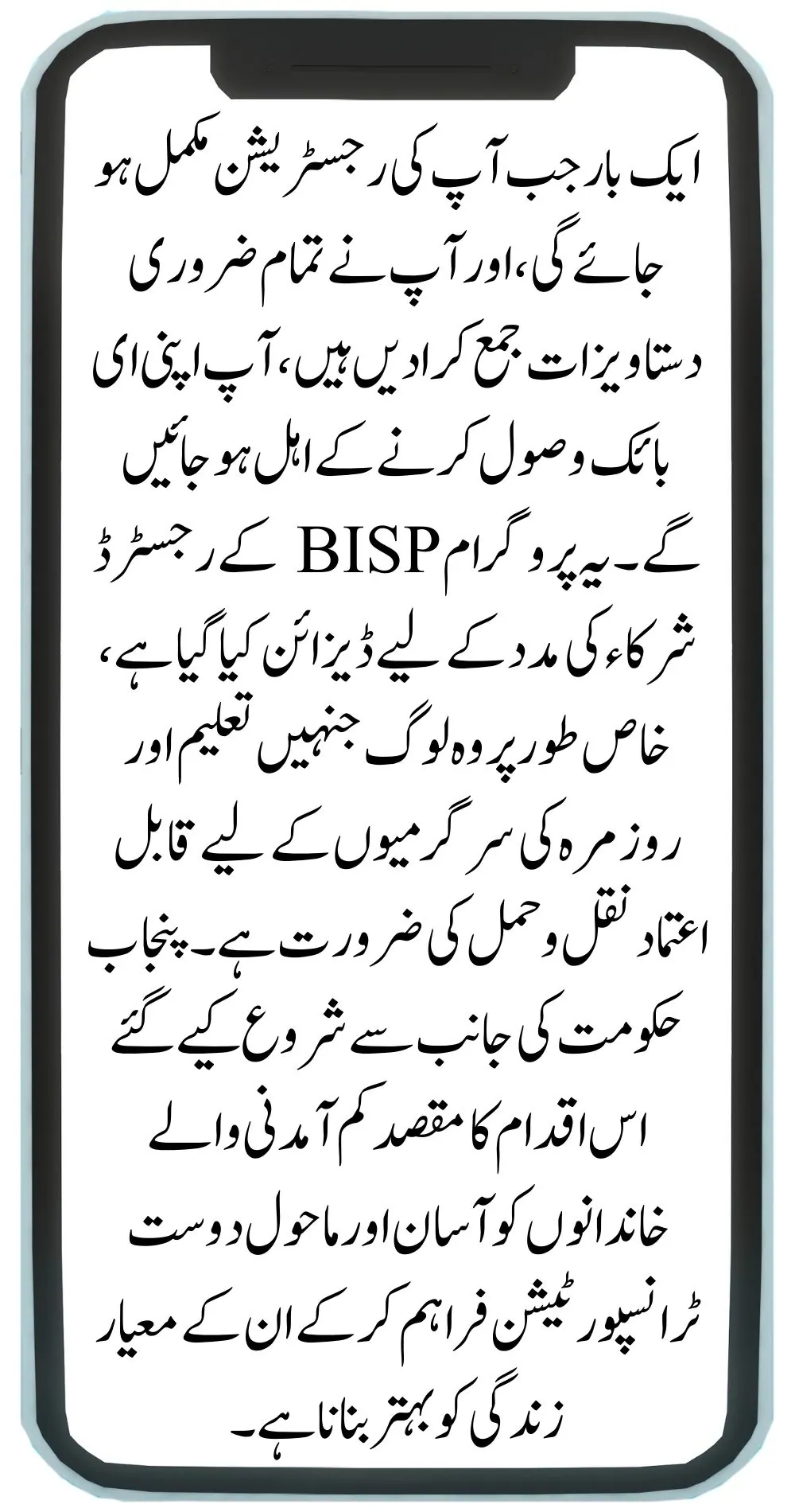Once your registration is complete, and you have submitted all the necessary documents, you will be eligible to receive your e-bike. The program is designed to assist registered BISP participants, especially those in need of reliable transportation for education and daily activities. This initiative, launched by the Punjab government, aims to improve the quality of life for low-income families by providing them with convenient and eco-friendly transportation.