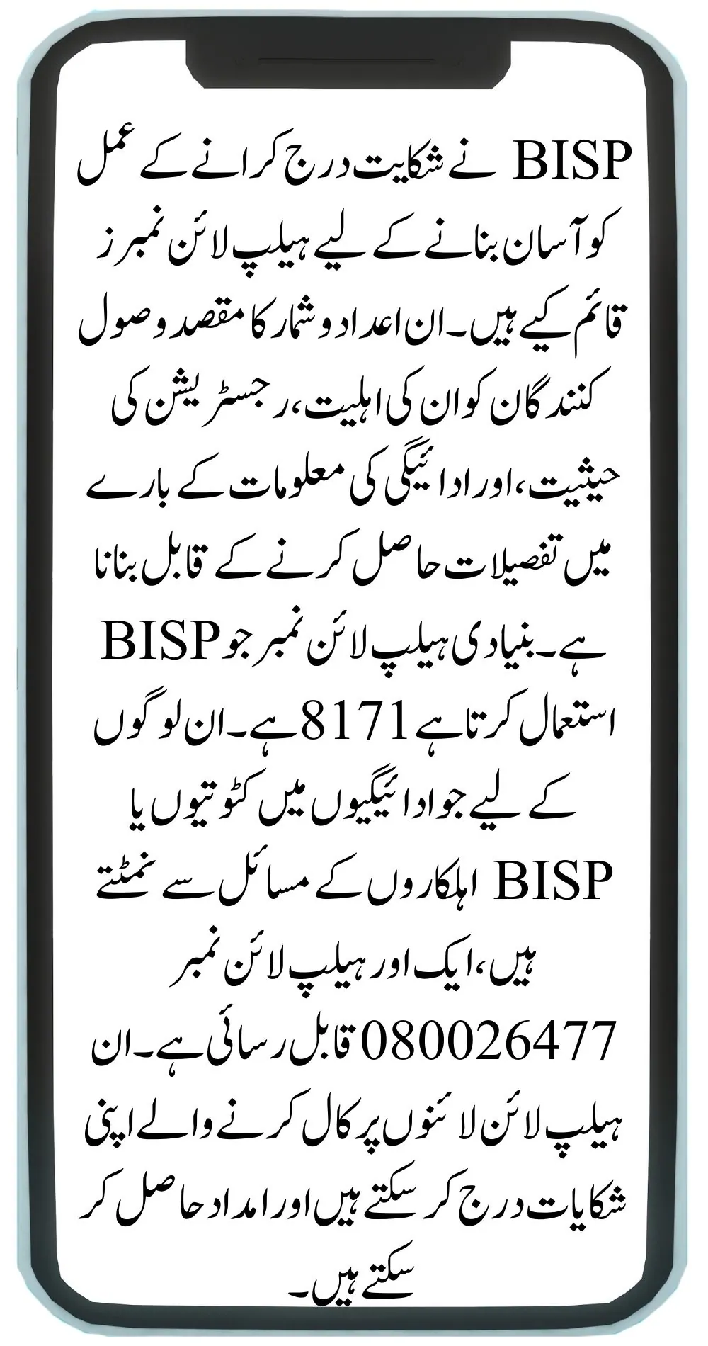 BISP has established helpline numbers to simplify the process of complaint filing. These figures are meant to enable recipients to obtain details about their eligibility, registration status, and payment information. The main helpline number BISP uses is 8171. For those who deal with payment deductions or BISP personnel issues, another helpline number 080026477 is accessible. Callers to these helpline lines can register their grievances and get aid.