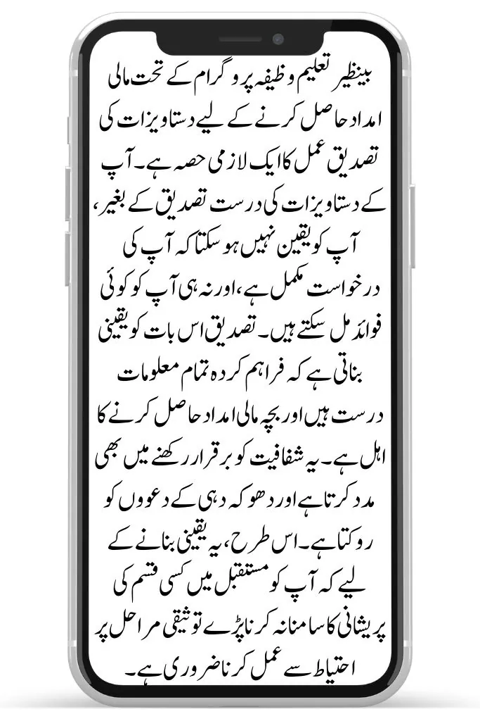 Document verification is an essential part of the process for receiving financial aid under the Benazir Taleemi Wazifa program. Without proper verification of your documents, you cannot be certain that your application is complete, nor can you receive any benefits. The verification ensures that all the information provided is accurate and that the child is eligible to receive the financial assistance. It also helps maintain transparency and prevents fraudulent claims. Thus, it is important to follow the verification steps carefully to ensure you do not face any issues in the future.