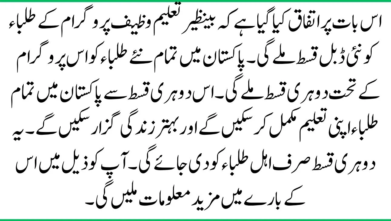 It has been agreed that the Benazir Taleemi Wazaif program students will receive a new double installment. All new students in Pakistan will receive a double installment under this program. With this double installment, all students in Pakistan would be able to complete their studies and live a better life. This double installment will be delivered only to qualifying students. You will find more information about this below.