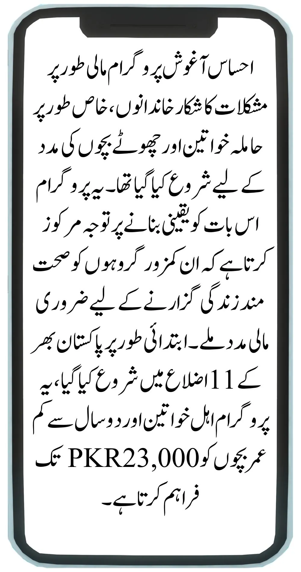 The Ehsaas Aghosh Program was launched to support financially struggling families, particularly those with pregnant women and young children. The program focuses on ensuring that these vulnerable groups receive the necessary financial support to lead healthy lives. Initially started in 11 districts across Pakistan, the program provides up to 23,000 PKR to eligible women and children under the age of two.