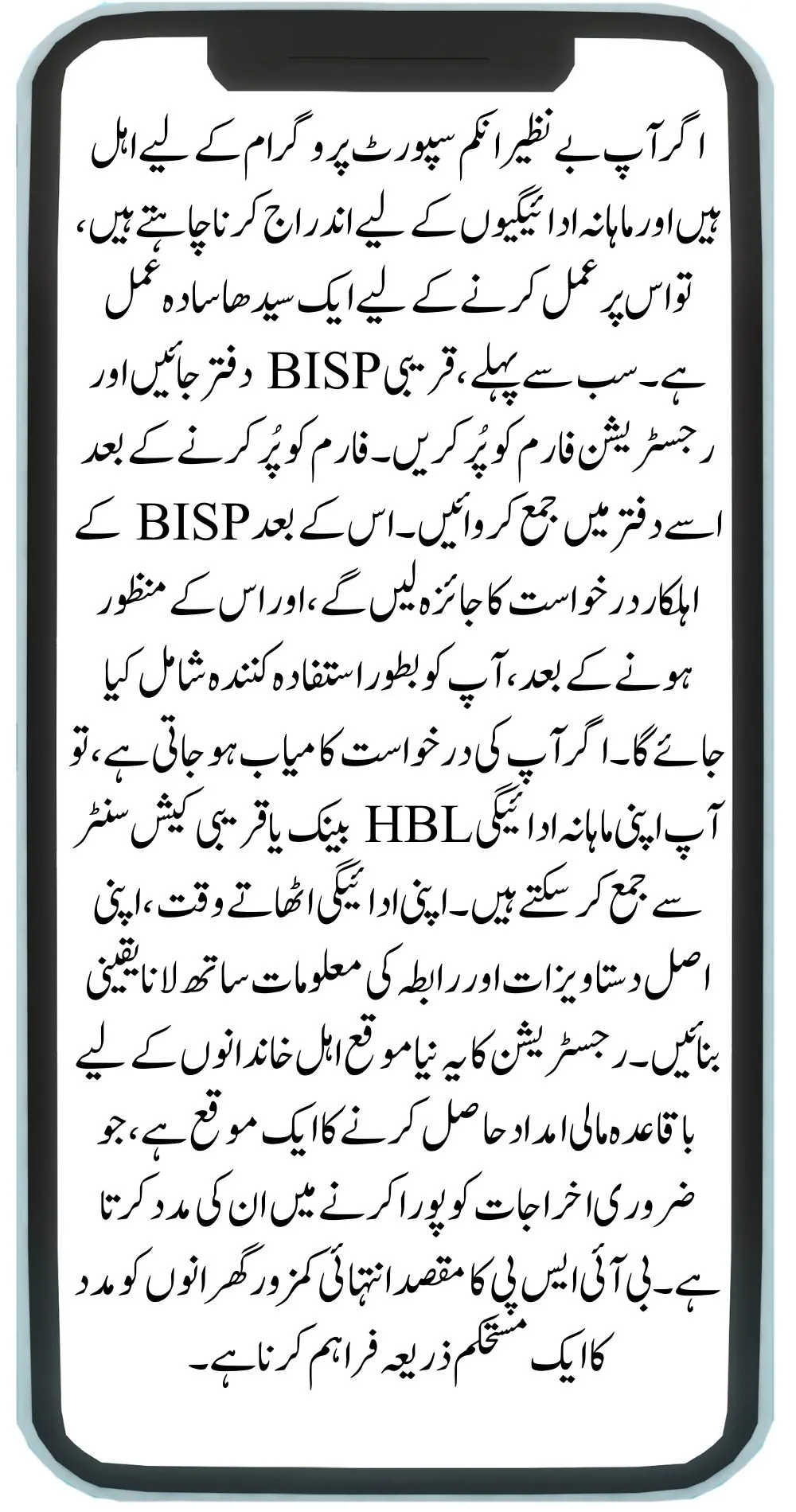 If you are eligible for the Benazir Income Support Program and want to register for the monthly payments, there is a straightforward process to follow. First, visit the nearest BISP office and complete the registration form. After filling out the form, submit it to the office. BISP officials will then review the application, and once it’s approved, you will be added as a beneficiary. If your application is successful, you can collect your monthly payment from an HBL bank or the closest cash center. When picking up your payment, make sure to bring your original documents and contact information. This new registration opportunity is a chance for eligible families to secure regular financial assistance, helping them cover essential expenses. The goal of BISP is to provide a stable source of support to the most vulnerable households.