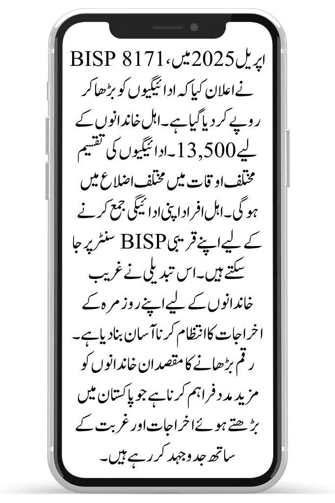 In April 2025, BISP 8171 announced that payments have been increased to Rs. 13,500 for eligible families. The distribution of payments will happen in different districts at different times. Those who qualify can visit their nearest BISP center to collect their payment. This change has made it easier for poor families to manage their daily expenses. The goal of increasing the amount is to provide more support to families who are struggling with rising costs and poverty in Pakistan.