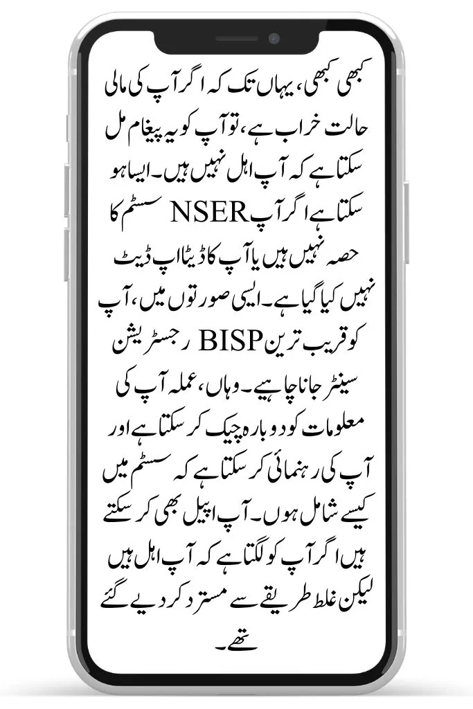 Sometimes, even if your financial condition is poor, you may get a message saying you are not eligible. This can happen if you are not part of the NSER system or your data is not updated. In such cases, you should visit the nearest BISP registration center. There, the staff can re-check your information and guide you on how to join the system. You might also be able to appeal if you think you qualify but were wrongly rejected.