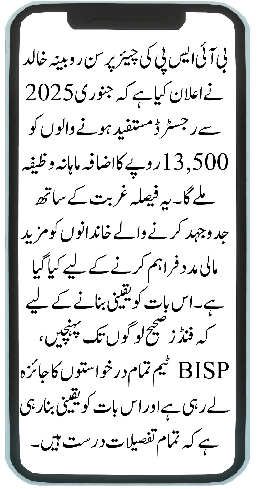 BISP Chairperson Rubina Khalid has announced that starting in January 2025, registered beneficiaries will receive an increased monthly stipend of Rs 13,500. This decision was made to provide more financial support to families struggling with poverty. To ensure that the funds reach the right people, the BISP team is reviewing all applications and ensuring that all details are accurate.