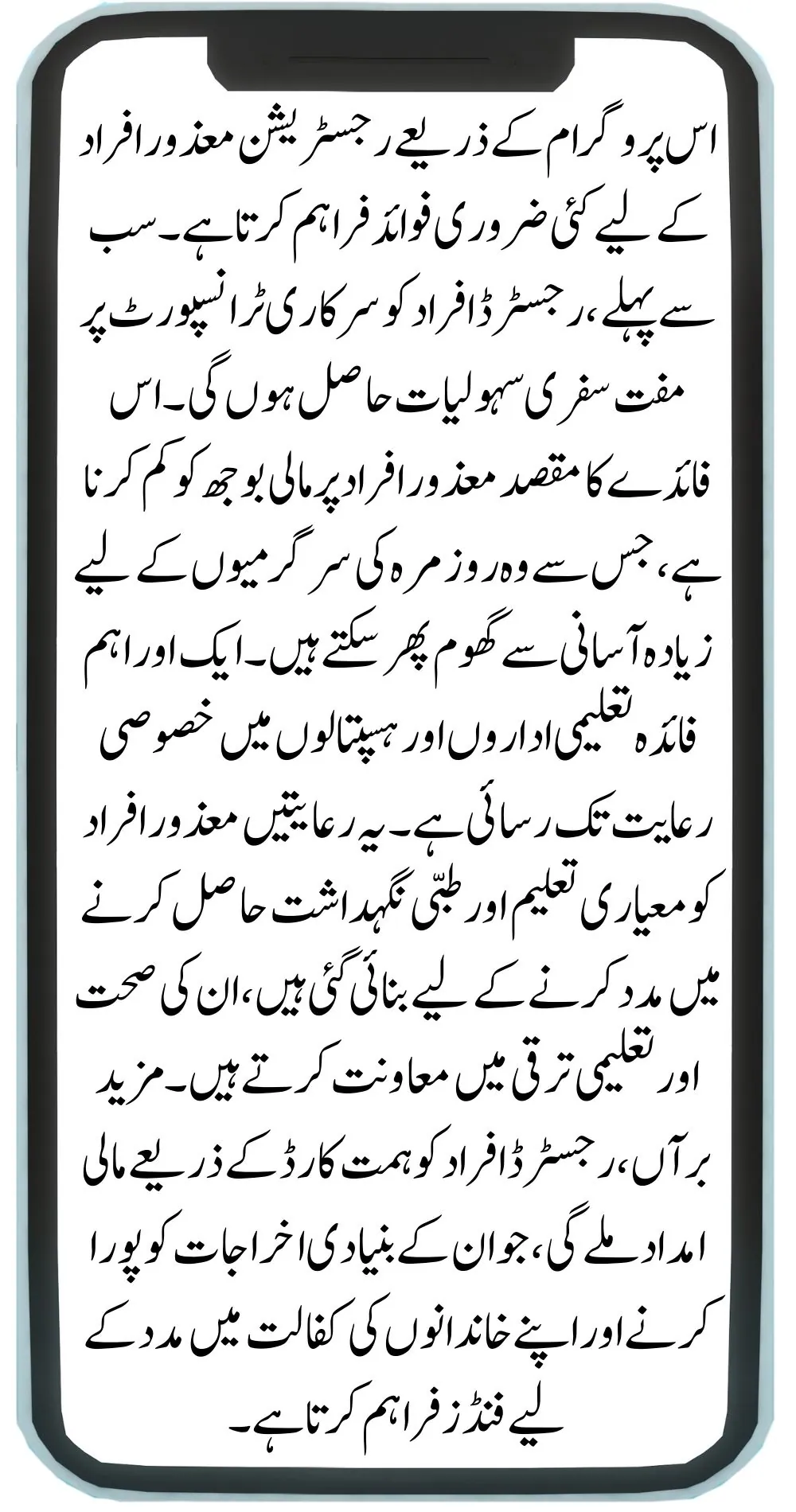 Registering through this program provides several essential benefits for persons with disabilities. Firstly, those registered will receive free travel facilities on government transport. This benefit aims to reduce the financial burden on disabled persons, enabling them to move around more easily for daily activities. Another important advantage is access to special discounts at educational institutions and hospitals. These discounts are designed to help disabled persons receive quality education and medical care, supporting their health and academic growth. Additionally, registered individuals will receive financial aid through the Himat Card, which provides funds to help them cover their basic expenses and support their families.