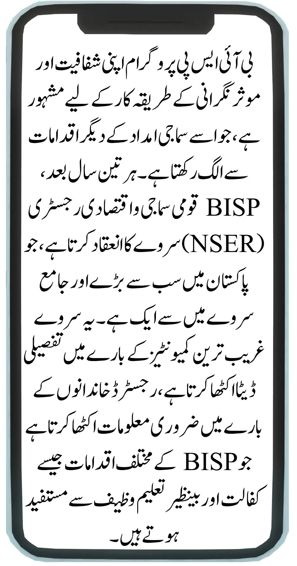 The BISP Program is renowned for its transparency and effective monitoring mechanisms, which set it apart from other social assistance initiatives. Every three years, BISP conducts the National Socio-Economic Registry (NSER) Survey, one of the largest and most comprehensive surveys in Pakistan. This survey collects detailed data on the poorest communities, gathering essential information about registered families who benefit from various BISP initiatives such as Kafalat and Benazir Taleemi Wazaif.