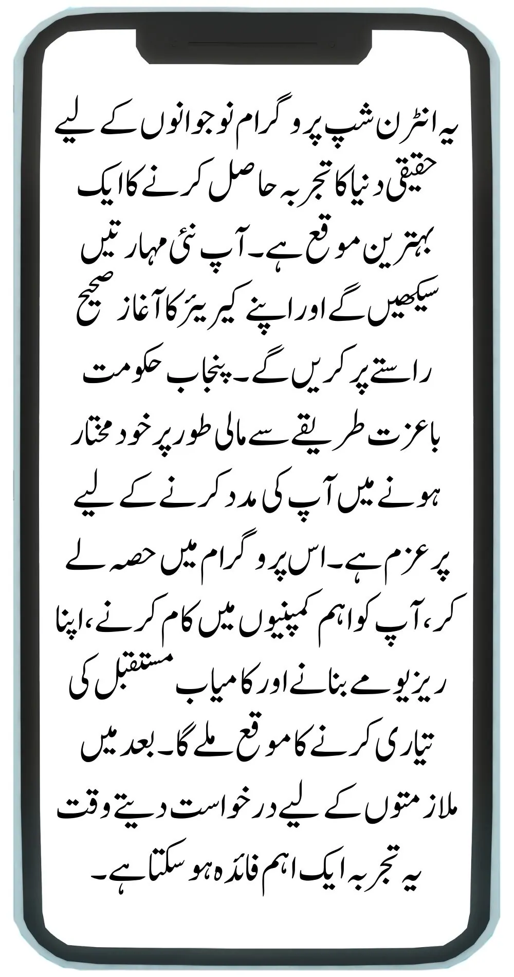 This internship program is an excellent opportunity for young people to gain real-world experience. You will learn new skills and start your career on the right path. The Punjab government is committed to helping you become financially independent in a respectable way. By participating in this program, you will have the chance to work in important companies, build your resume, and prepare for a successful future. This experience can be a significant advantage when applying for jobs later on.
