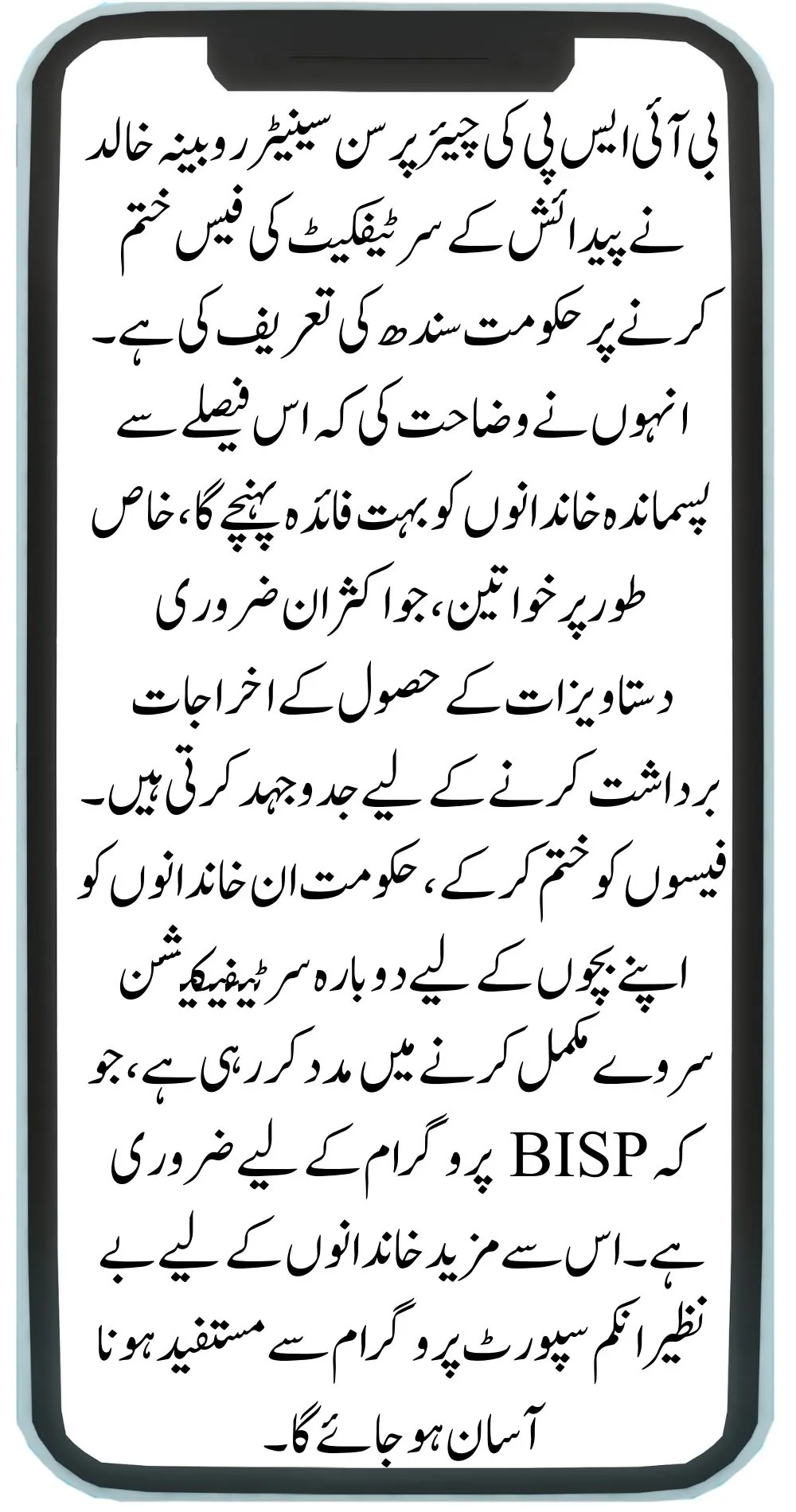 BISP Chairperson Senator Rubina Khalid has praised the Sindh Government for removing the birth certificate fees. She explained that this decision will greatly benefit disadvantaged families, especially women, who often struggle to afford the cost of obtaining these necessary documents. By eliminating the fees, the government is helping these families complete the recertification surveys for their children, which is a requirement for the BISP program. This will make it easier for more families to benefit from the Benazir Income Support Program.