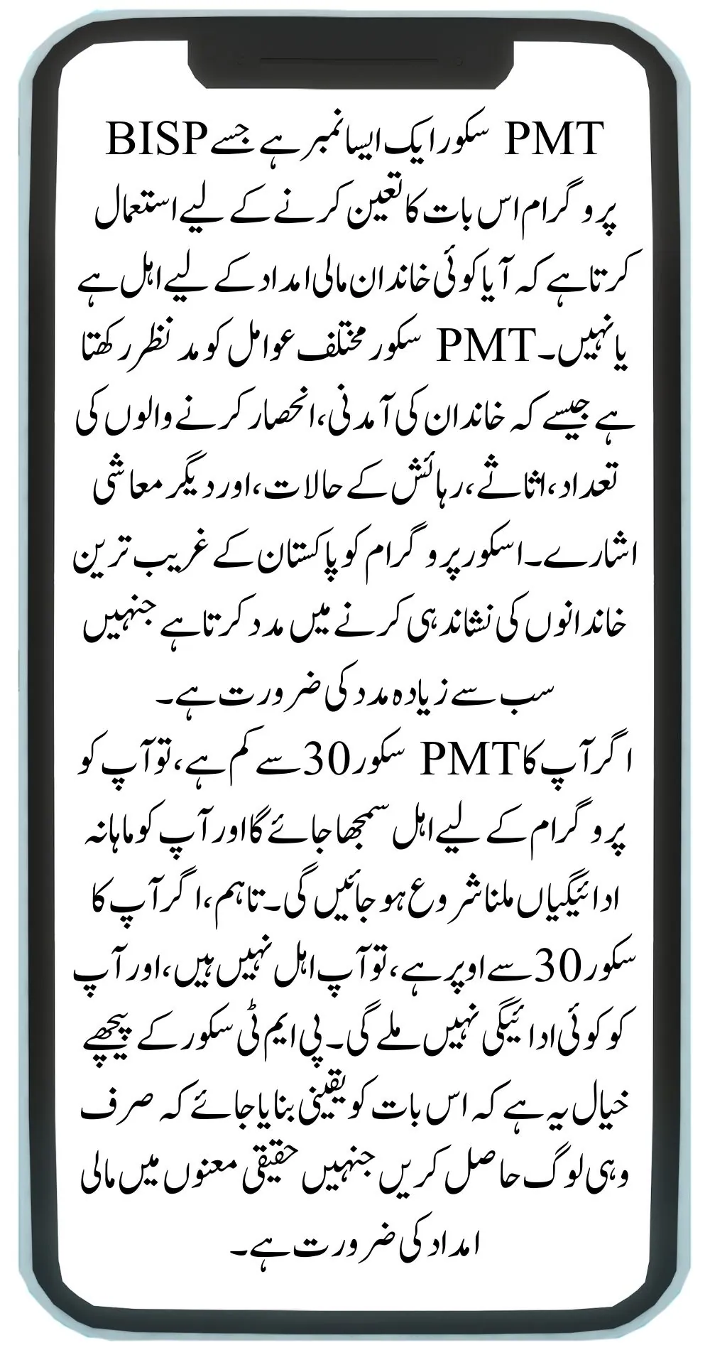 The Benazir Income Support Program (BISP) is a lifeline for many low-income families in Pakistan. This program offers financial aid to those who need it the most. However, to make sure the aid goes to the right people, BISP uses a system called the Poverty Means Test (PMT) Score. This score determines who is eligible for the program. If your PMT score is below 30, you are eligible for the program, and you will start receiving payments. But if your PMT score is above 30, you are considered ineligible.