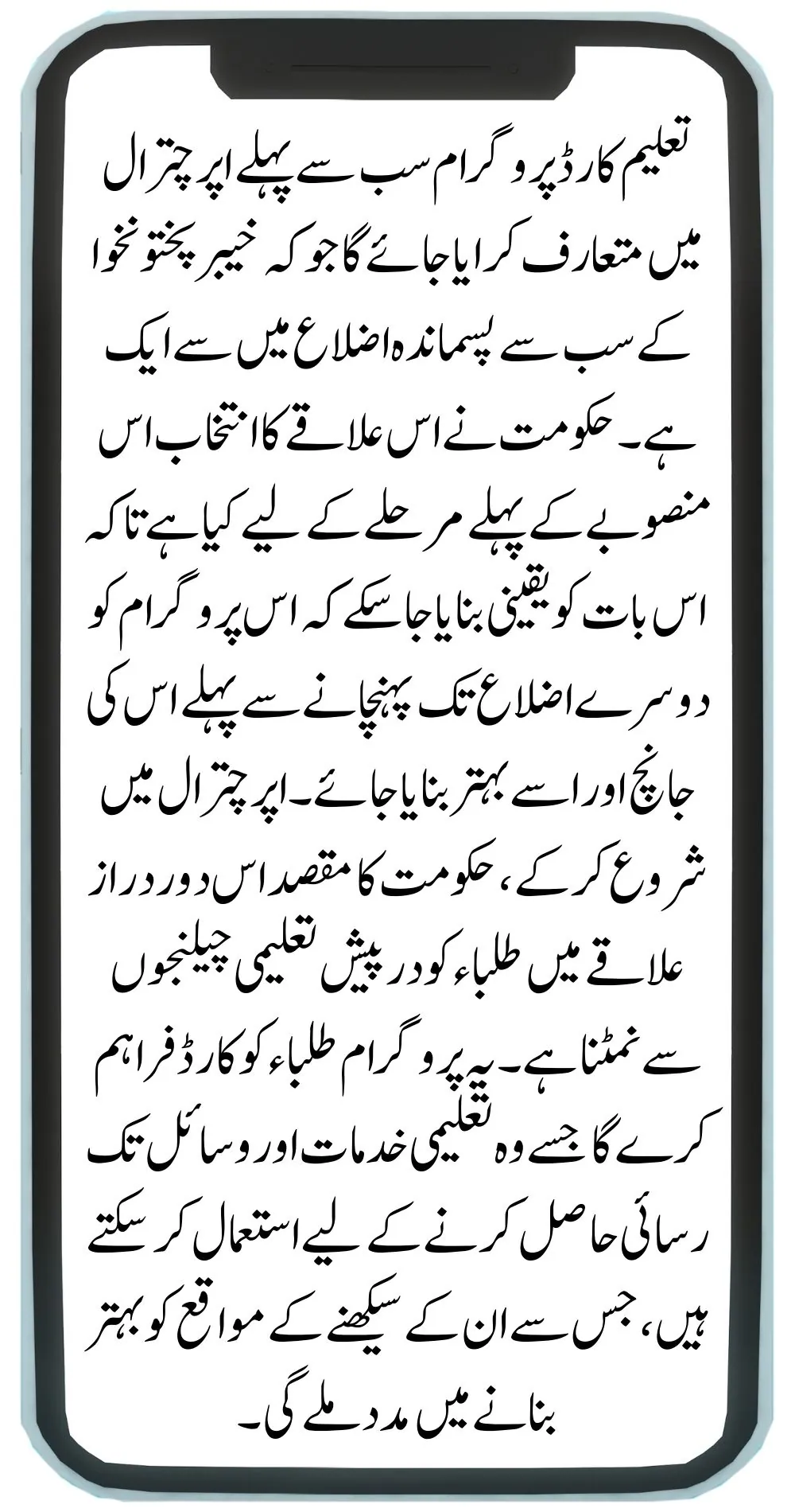 The KP government plans to implement the Taleem Card program in a phased approach. After launching the program in Upper Chitral, the government will refine the process based on the results and feedback from this district. The program will then be expanded to other districts across Khyber Pakhtunkhwa.