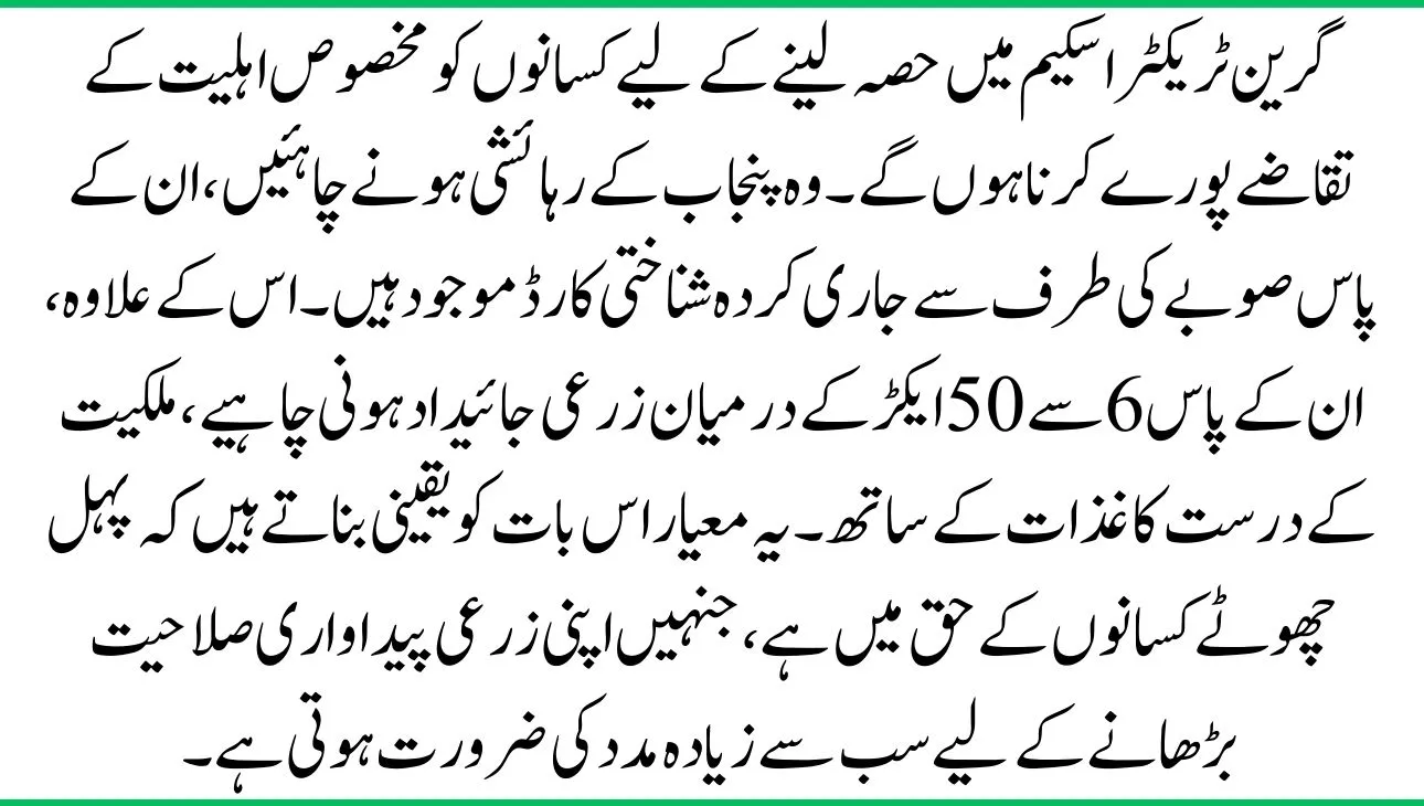 Farmers must achieve specific eligibility requirements to participate in the Green Tractor Scheme. They must be Punjab residents, holding ID cards issued by the province. In addition, they should own between 6 and 50 acres of agricultural property, with valid ownership papers. These criteria ensure that the initiative favors small farmers, who require the most assistance to increase their agricultural productivity.