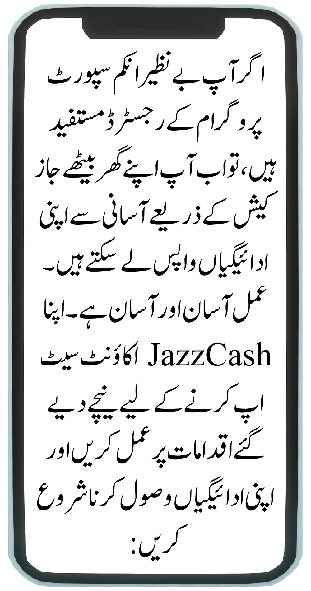 If you are a registered beneficiary of the Benazir Income Support Program, you can now easily withdraw your payments through JazzCash from the comfort of your home. The process is simple and convenient. Follow the steps below to set up your JazzCash account and start receiving your payments: