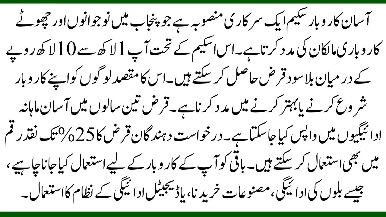 The Asaan Karobar Scheme is a government project that helps young people and small business owners in Punjab. Under this scheme, you can get an interest-free loan between 1 lakh to 10 lakh rupees. The purpose is to help people start or improve their businesses. The loan can be paid back over three years in easy monthly payments. Applicants can also use up to 25% of the loan in cash. The rest should be used for your business, like paying bills, buying products, or using digital payment systems.