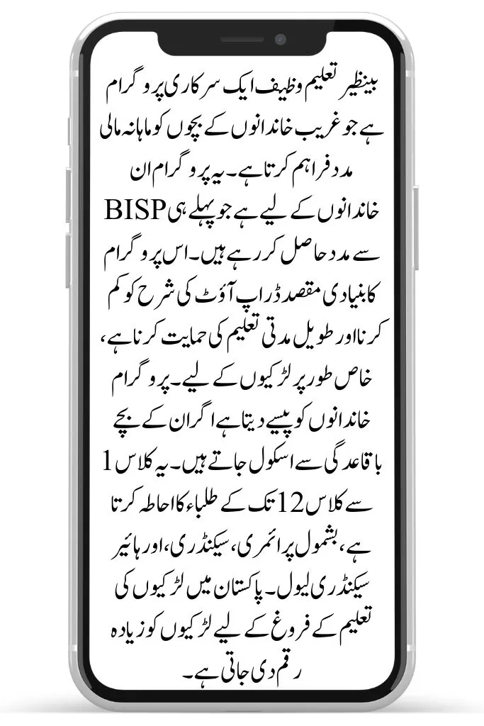 Benazir Taleemi Wazaif is a government program that provides monthly financial help to children of poor families. This program is for those families who are already receiving help from BISP. The main goal of this program is to reduce dropout rates and support long-term education, especially for girls. The program gives money to families if their children attend school regularly. It covers students from class 1 to class 12, including primary, secondary, and higher secondary levels. Girls are given higher amounts to promote girls’ education in Pakistan.
